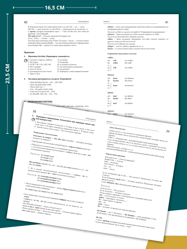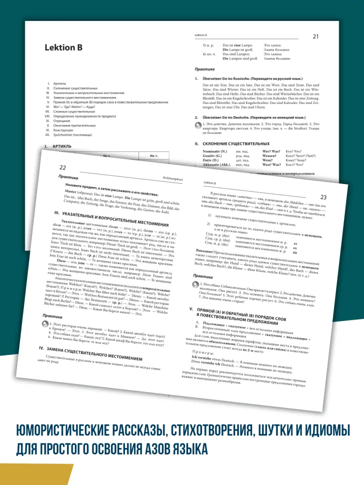 Учебное пособие можно содержит 2 уровня изучения немецкого языка. 1-й уровень рассчитан на 100 часов занятий. 2-й уровень непосредственно дополняет 1-й. Он рассчитан еще на 120 часов занятий. Пособие содержит все главные аспекты изучения языка, включая словарный запас (общая и разговорная лексика), задания к текстам, грамматику и грамматические упражнения. Здесь можно найти также много забавных коротких рассказов, стихотворений, шуток и идиом. Для тех, кто хочет научиться правильному немецкому произношению и развить навыки аудирования, подготовлена аудиозапись, сделанная носителями языка.