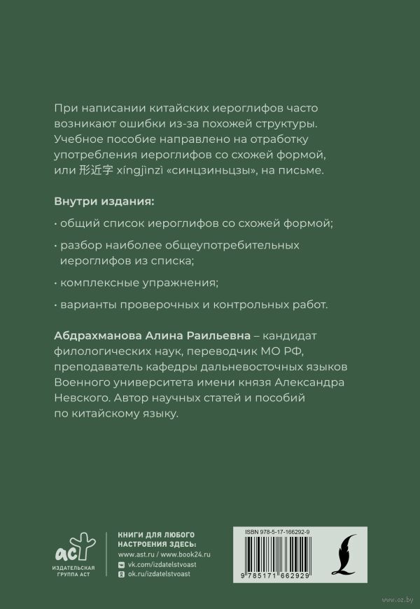 Данное учебное пособие направлено на отработку написания и чтения иероглифов со схожей формой. Для составления списка иероглифов со схожей формой были проанализированы базовые учебные пособия, используемые для обучения детей в начальной и средней школах в Китае. Издание содержит общий список иероглифов со схожей формой, разбор наиболее распространенных иероглифов из списка, комплексные упражнения, варианты контрольных и проверочных работ.