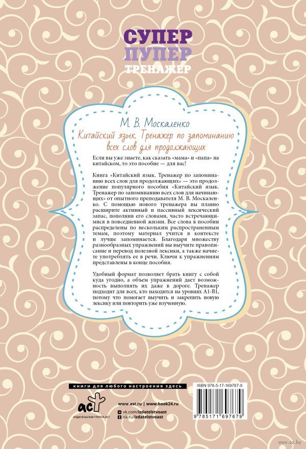 Книга "Китайский язык. Тренажер по запоминанию всех слов для продолжающих" – это продолжение популярного пособия "Китайский язык. Тренажер по запоминанию всех слов для начинающих" от опытного преподавателя М. В. Москаленко. С помощью нового тренажера вы плавно расширите активный и пассивный лексический запас, пополнив его словами, часто встречающимися в повседневной жизни. Все слова в пособии распределены по нескольким распространенным темам, поэтому материал учится в контексте и лучше запоминается. Благодаря множеству разнообразных упражнений вы выучите правописание и перевод полезной лексики, а также начнете употреблять ее в речи. Ключи к упражнениям представлены в конце пособия.