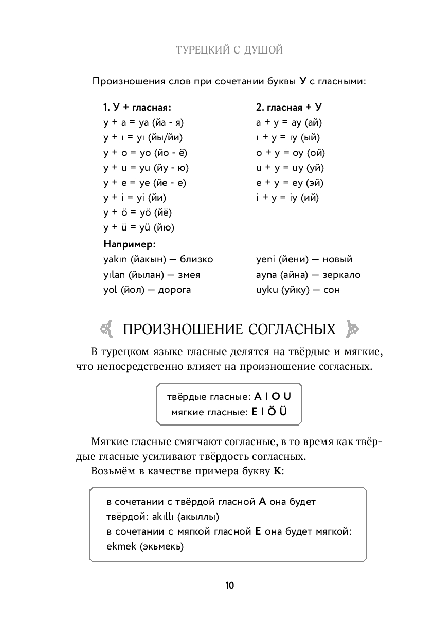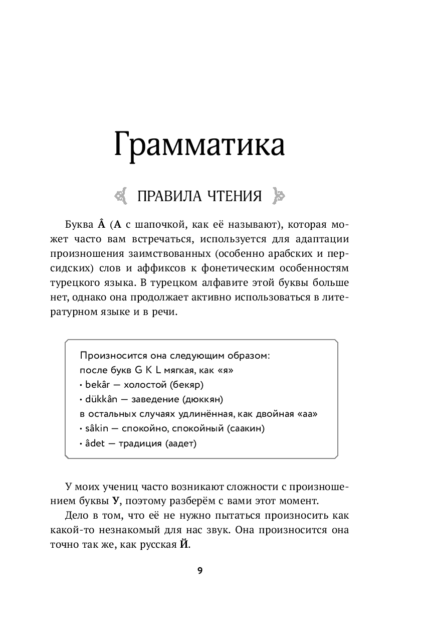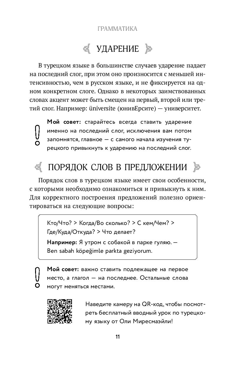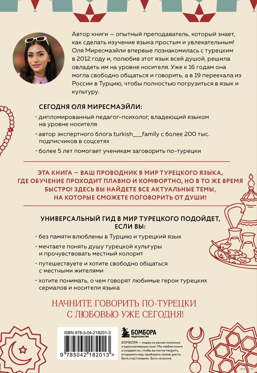 Эта книга – универсальный гид по турецкому языку, благодаря которому вы прочувствуете душу этой удивительной страны! В этом вам поможет Оля Миресмаэйли – опытный преподаватель и автор экспертного блога с аудиторией более 200 тыс. подписчиков в социальных сетях. Она много лет прожила в Турции и владеет турецким на уровне носителя. Уникальный формат самоучителя и разговорника позволит легко понимать язык, а также общаться по-турецки в самых разных ситуациях. Раздел грамматики оснащен полезными упражнениями для практики, а словарь и разговорник поделены на тематические разделы. Транскрипция на кириллице поможет быстро освоить звучание турецкого языка. Идеальный старт для тех, кто погружается в культуру всей душой и хочет заговорить на турецком с первого дня!