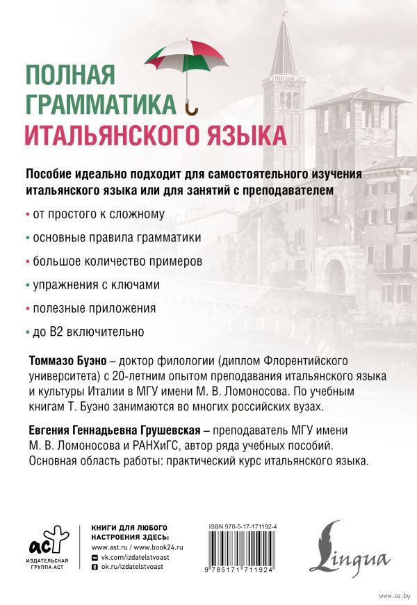 Томмазо Буэно – доктор филологии (диплом Флорентийского университета) с 20-летним опытом преподавания итальянского языка и культуры Италии в МГУ имени М. В. Ломоносова. Евгения Геннадьевна Грушевская – преподаватель МГУ имени М. В. Ломоносова и РАНХиГС.