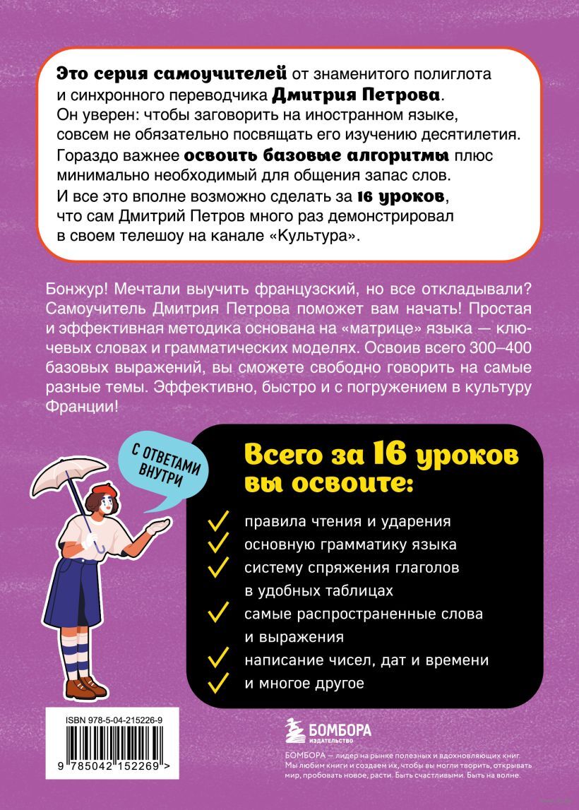 Это серия самоучителей от знаменитого полиглота и синхронного переводчика Дмитрия Петрова. Он уверен: чтобы заговорить на иностранном языке, совсем не обязательно посвящать его изучению десятилетия. Гораздо важнее освоить базовые алгоритмы, плюс – минимально необходимый для общения запас слов.