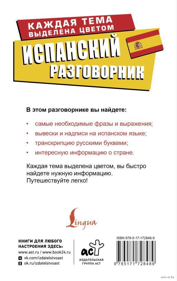Испанский разговорник содержит типичные модели фраз и выражений по широкому кругу тем. Испанский текст снабжен практической транскрипцией, передающей звуки испанского языка средствами русской графики. Каждый раздел обозначен своим цветом – вы легко и быстро найдете нужную информацию.