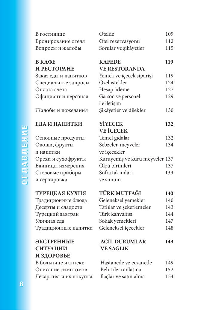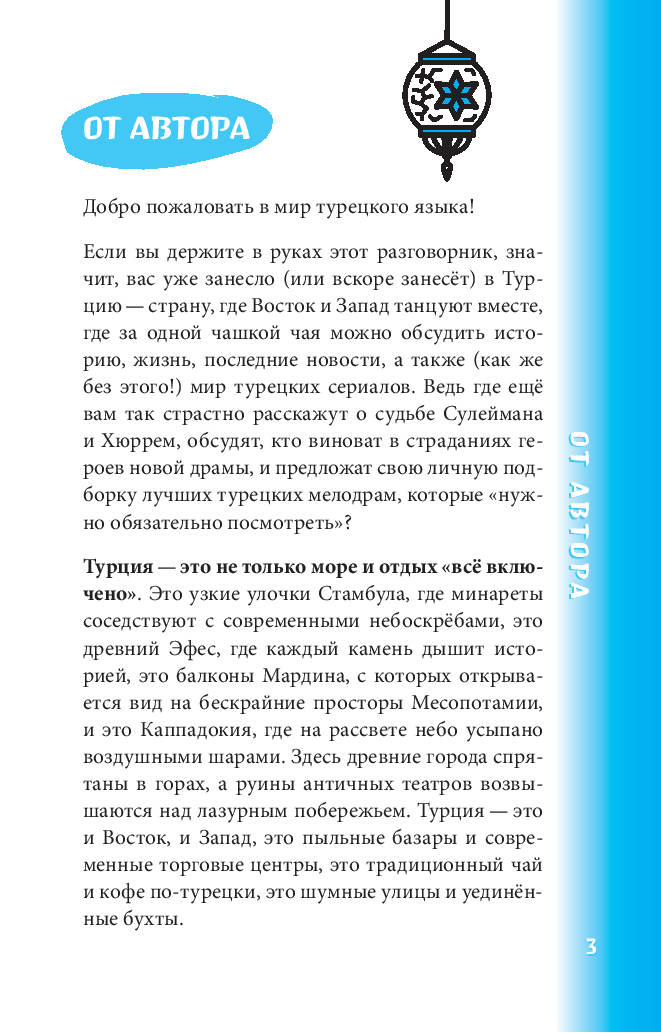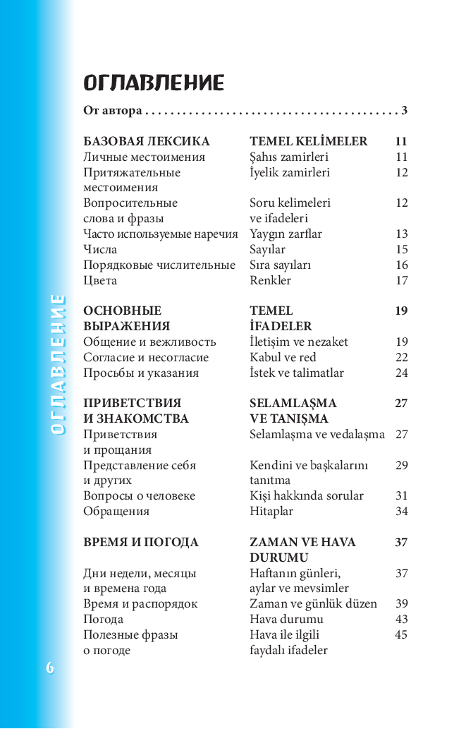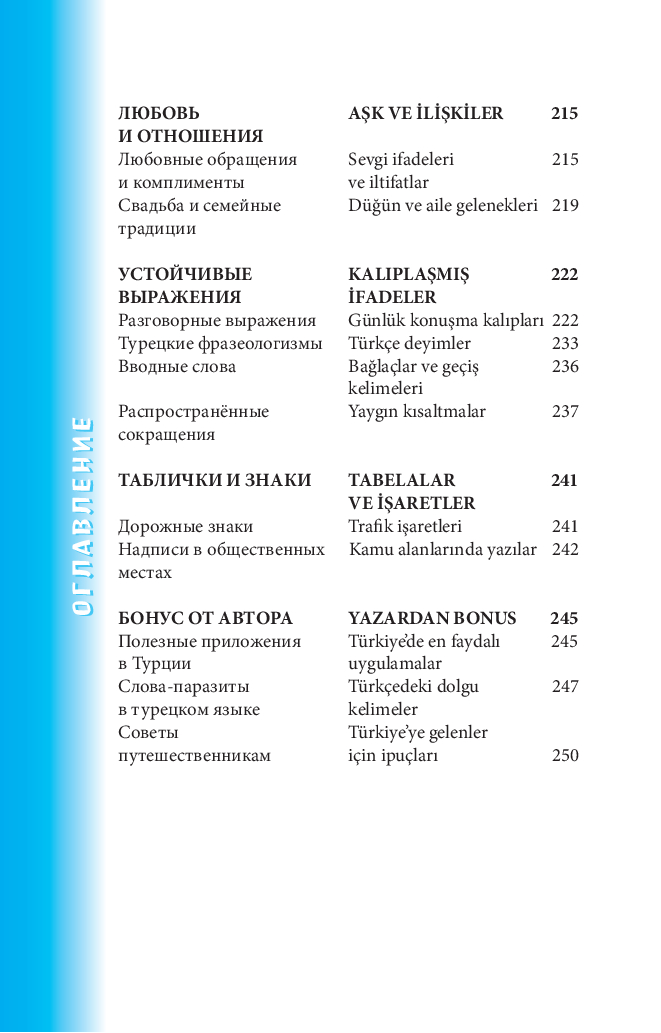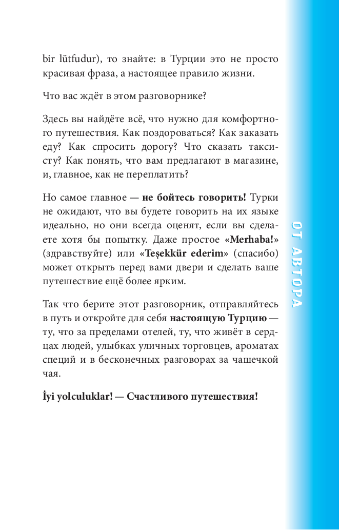 Турецкий разговорник содержит типовые фразы и выражения, встречающиеся в повседневной жизни. Тематические разделы помогут изъясниться на турецком языке в различных ситуациях: от заселения в отель до покупки сладостей на рынке. Выражения снабжены транскрипцией на кириллице, благодаря чему разговорник становится доступным для людей с начинающим уровнем изучения языка. Издание предназначено для русскоговорящих, выезжающих в Турцию, а также подходит для самостоятельного изучения разговорного языка.
