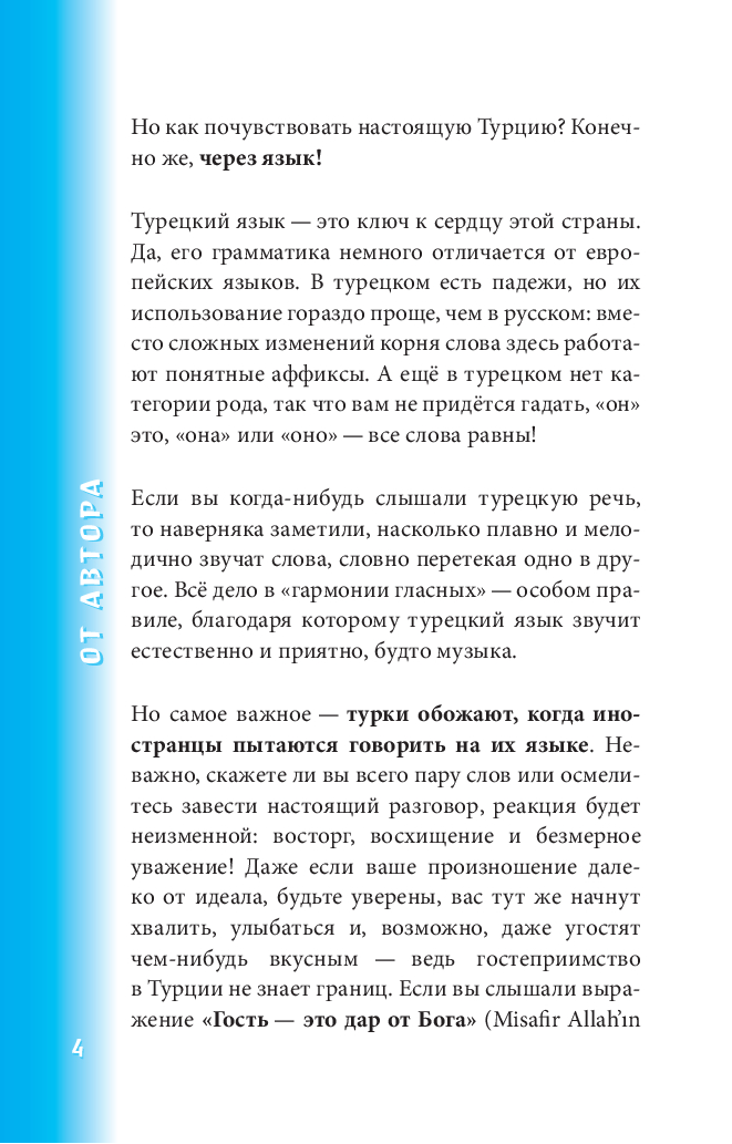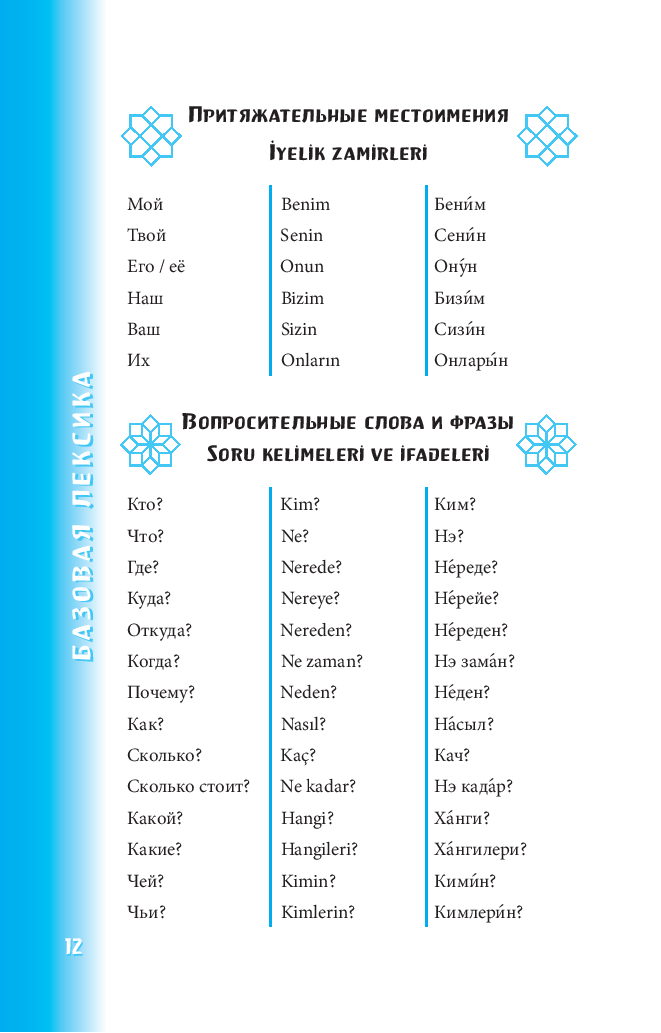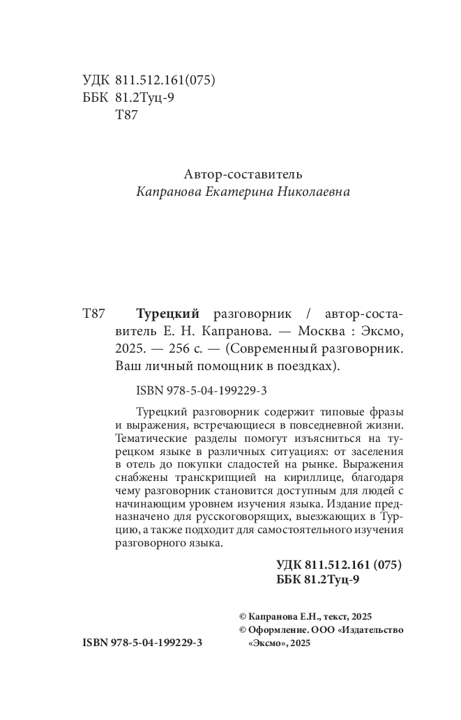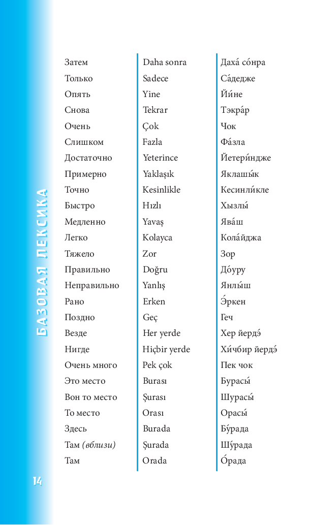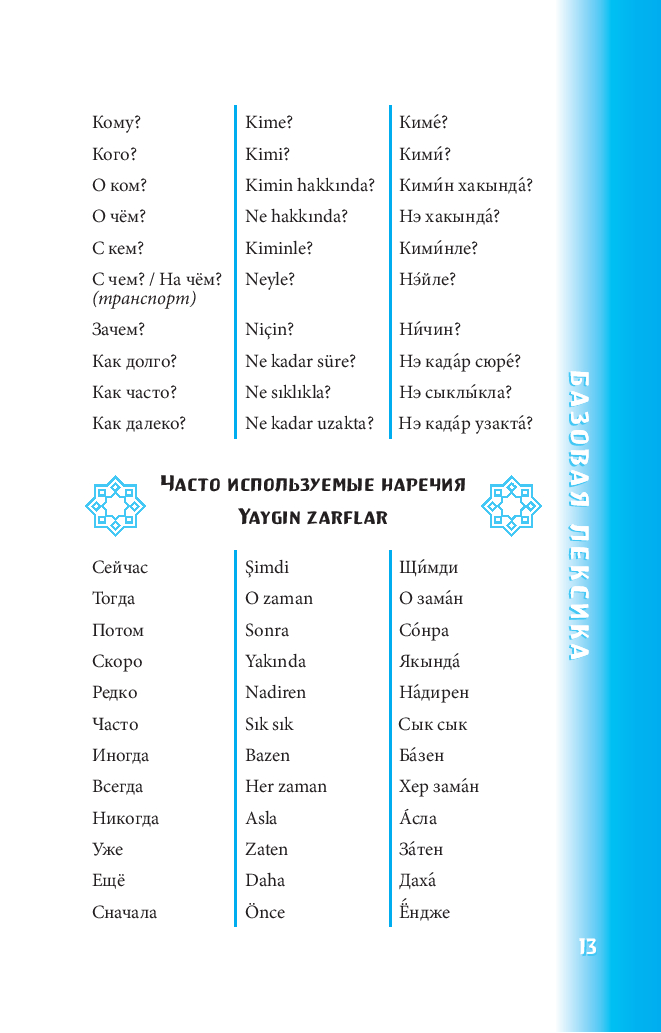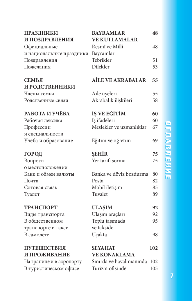 Турецкий разговорник содержит типовые фразы и выражения, встречающиеся в повседневной жизни. Тематические разделы помогут изъясниться на турецком языке в различных ситуациях: от заселения в отель до покупки сладостей на рынке. Выражения снабжены транскрипцией на кириллице, благодаря чему разговорник становится доступным для людей с начинающим уровнем изучения языка. Издание предназначено для русскоговорящих, выезжающих в Турцию, а также подходит для самостоятельного изучения разговорного языка.