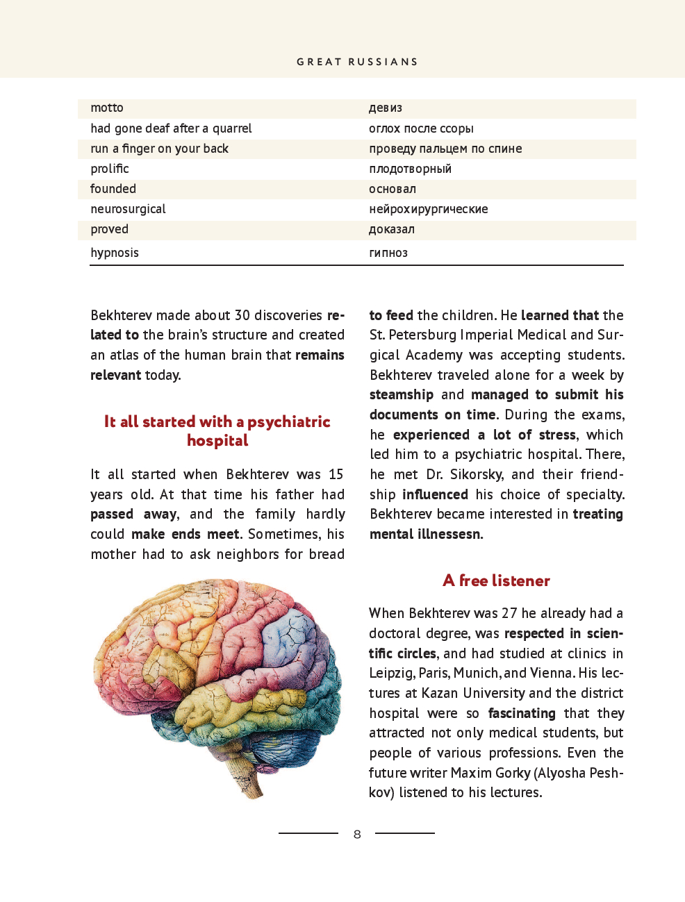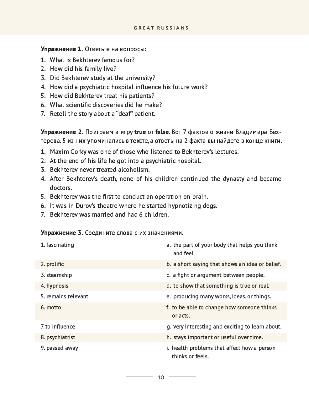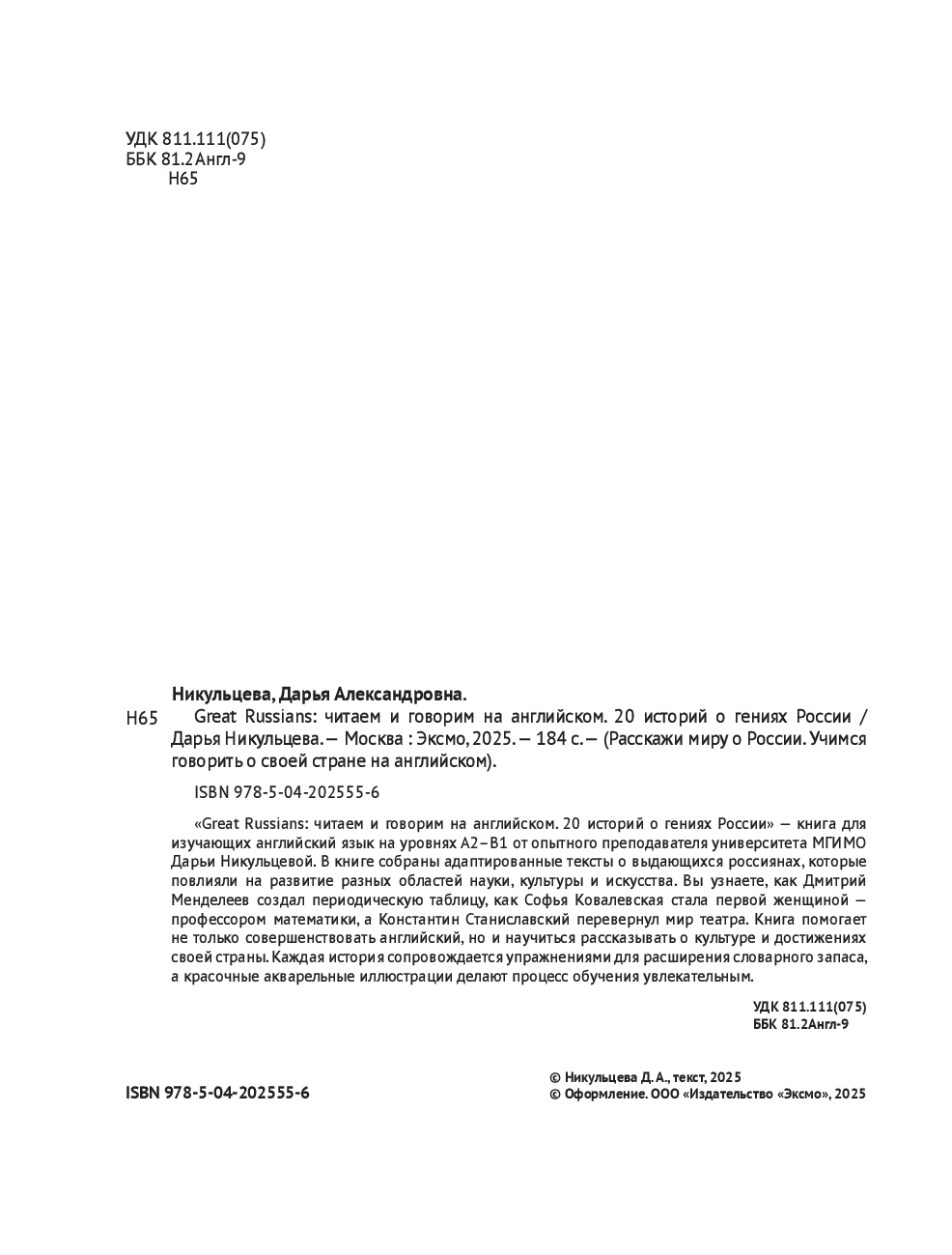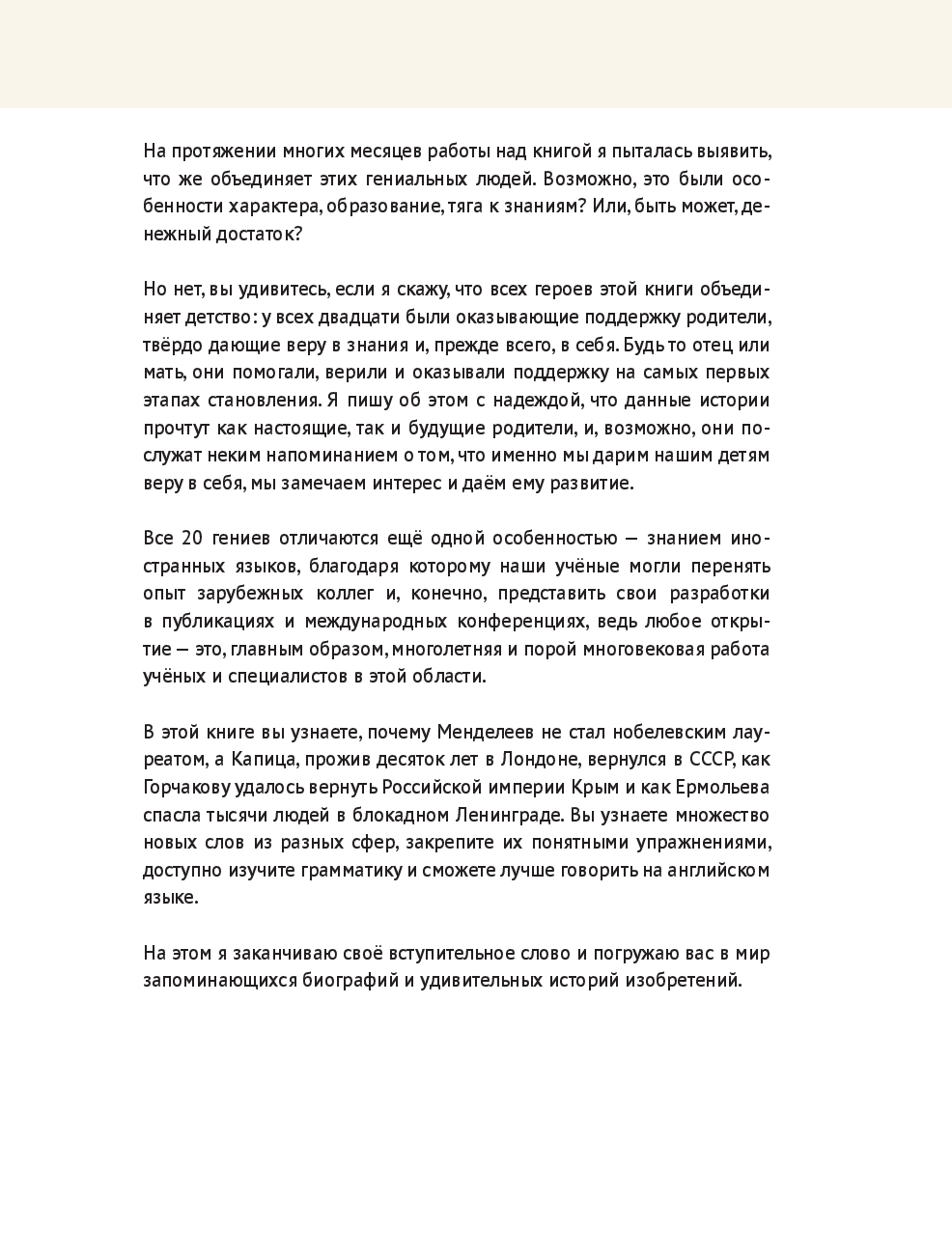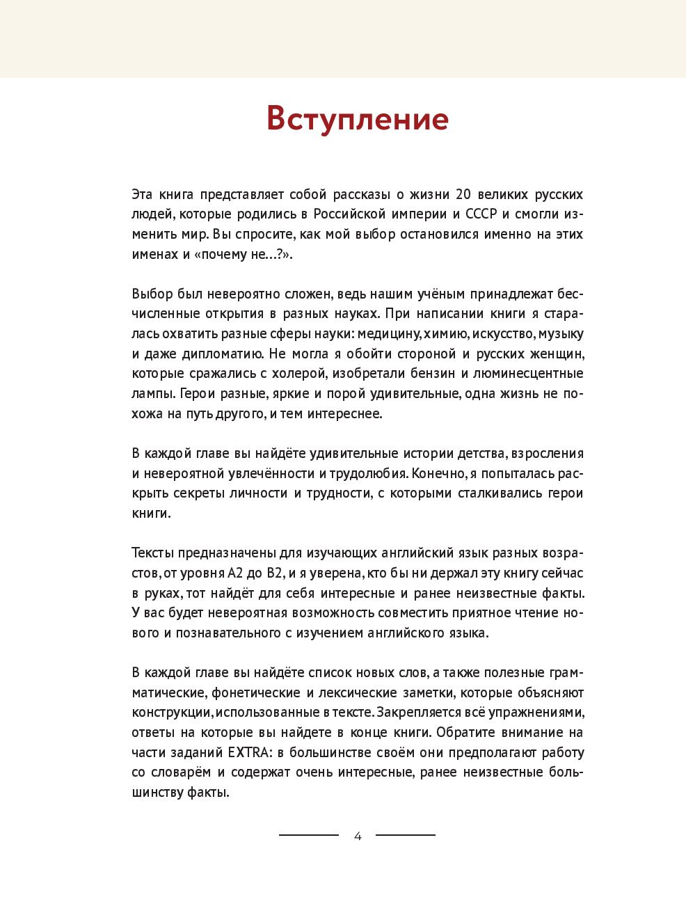 Эта книга рассказывает о 20 выдающихся россиянах, чьи идеи, открытия и таланты повлияли на мировую историю. Преподаватель МГИМО Дарья Никульцева составила и адаптировала тексты для уровней A2–B1, чтобы учить английский было легко и увлекательно.