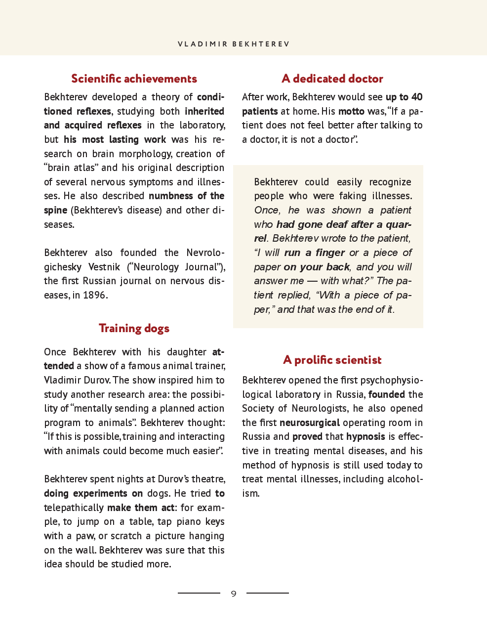 Кто стоял за созданием самых известных мелодий советского кино? Как Чайковский покорил весь мир своей музыкой? Почему система Станиславского стала основой для актеров Голливуда? Вы познакомитесь с учеными, музыкантами, художниками и изобретателями, чьи имена известны во всём мире. Узнаете, как создавались революционные открытия, какие препятствия приходилось преодолевать выдающимся личностям и чем они вдохновляют нас сегодня.