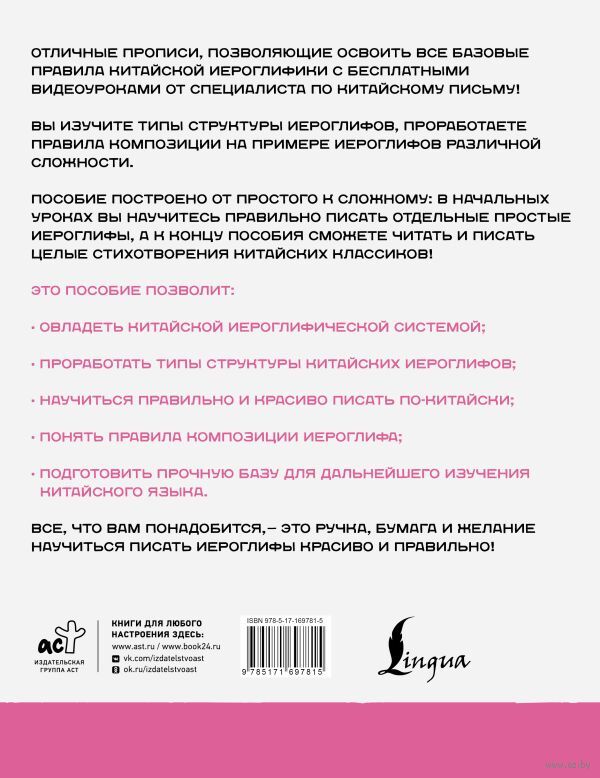 Прописи построены по принципу "от простого к сложному" и созданы специально для написания ручкой, а не кистью. Вы изучите все типы структуры китайских иероглифов и проработаете правила композиции на примере иероглифов различной сложности. Помимо инструкции по написанию, в пособии предусмотрен бесплатный интерактивный материал: в каждом уроке вы найдете QR-код со сслыкой на видеоурок от автора пособия и известного специалиста по китайской каллиграфии Цзин Сяопэна, который продемонстрирует правильную технику письма.