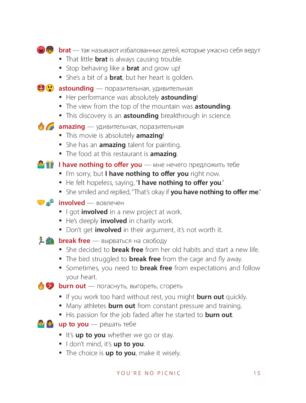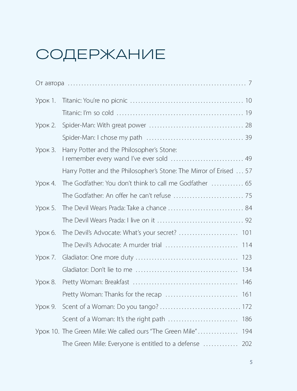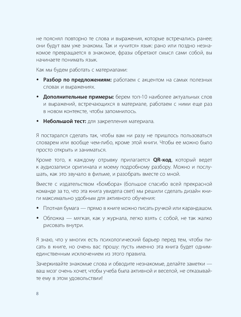 Вместо выдуманных диалогов здесь – настоящая речь носителей из 10 культовых кинолент с пошаговым разбором, примерами и авторскими пояснениями от профессионального лингвиста, преподавателя и блогера. Вас ждут полезные слова и выражения к каждому уроку, интересные задания, мини-тесты и аудиоматериалы с QR-кодами для тренировки восприятия на слух. Благодаря удобному формату вы сможете писать, отмечать новые слова и выражения прямо в книге, а также повторять материал в любое удобное время и в любом месте. Эта книга – идеальный помощник для тех, кто хочет учить английский с удовольствием и говорить, как герои любимых фильмов. Подробнее во введении расскажет сам автор – приятного обучения!