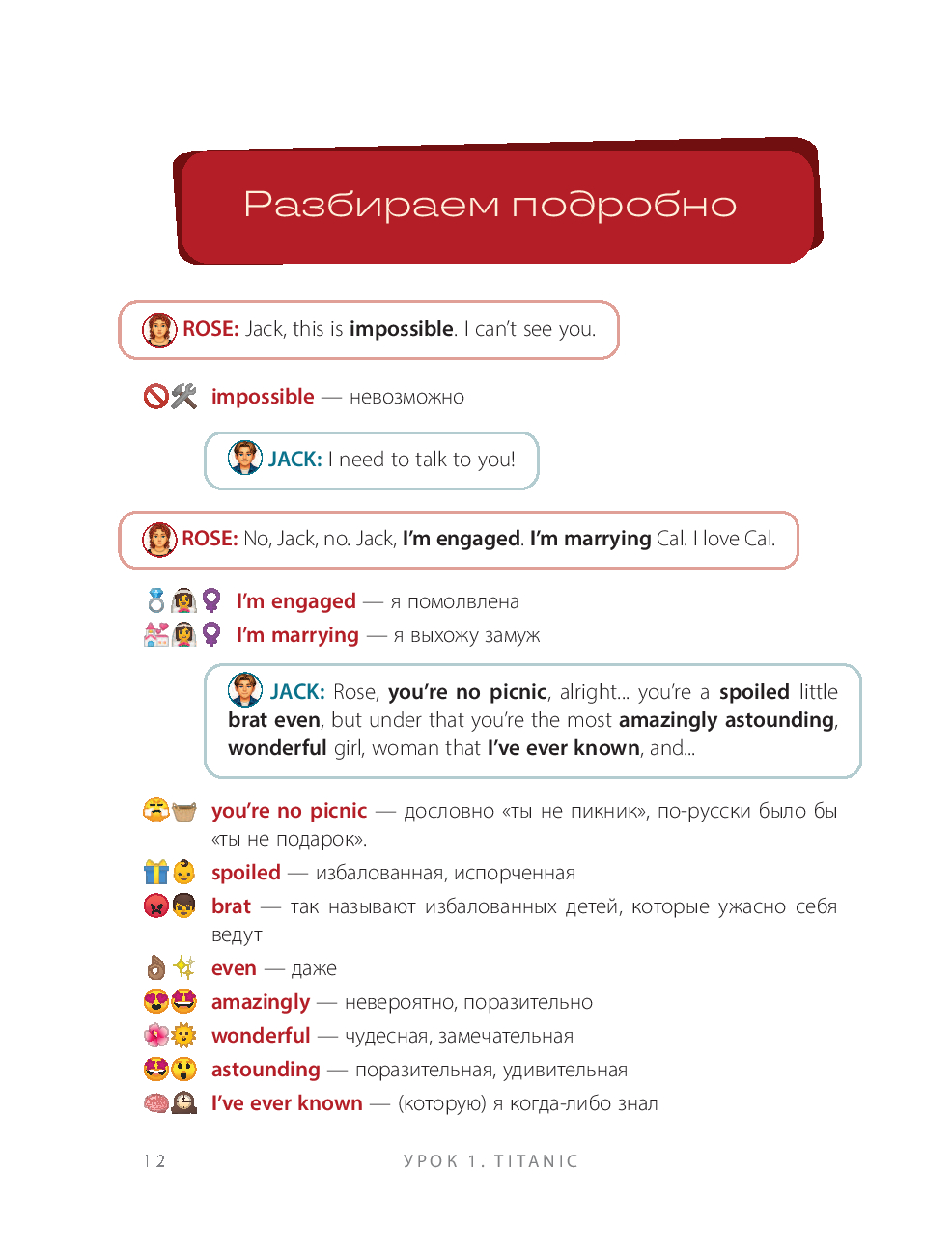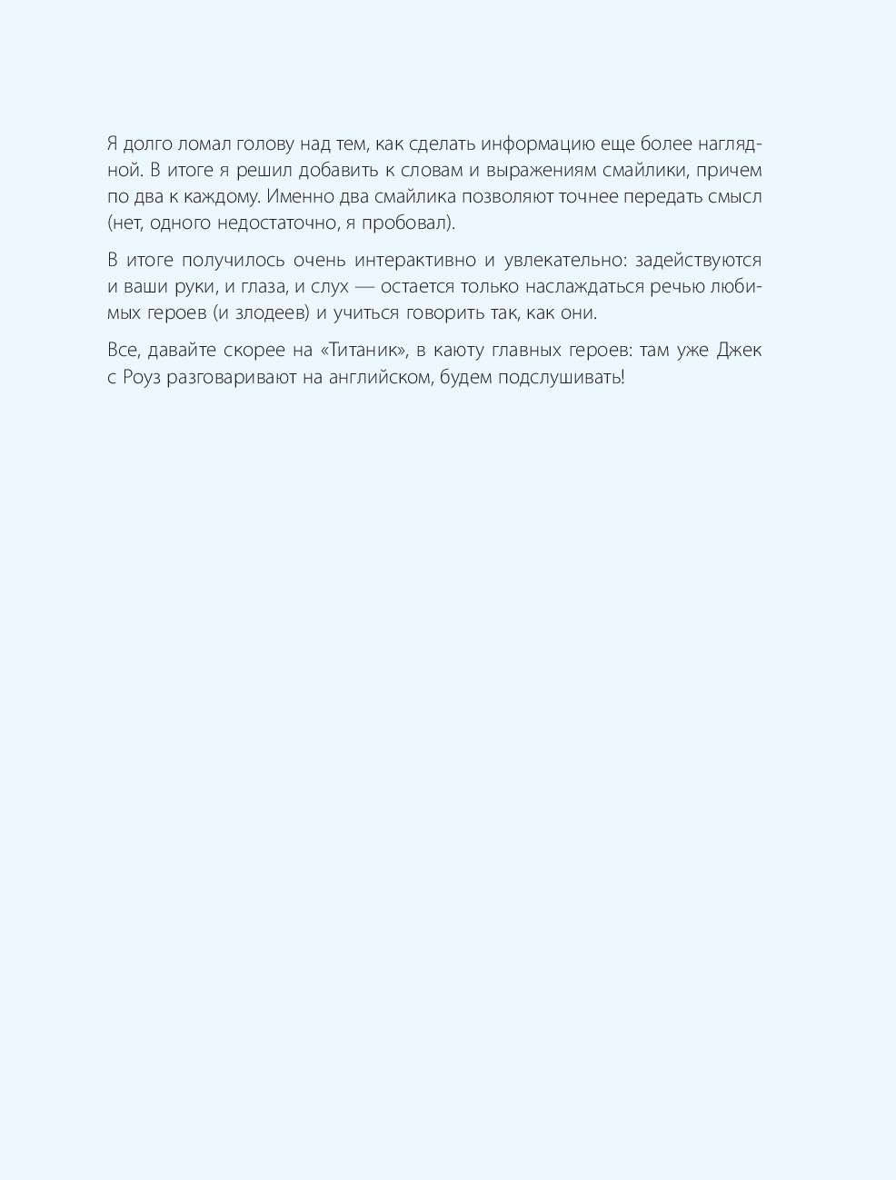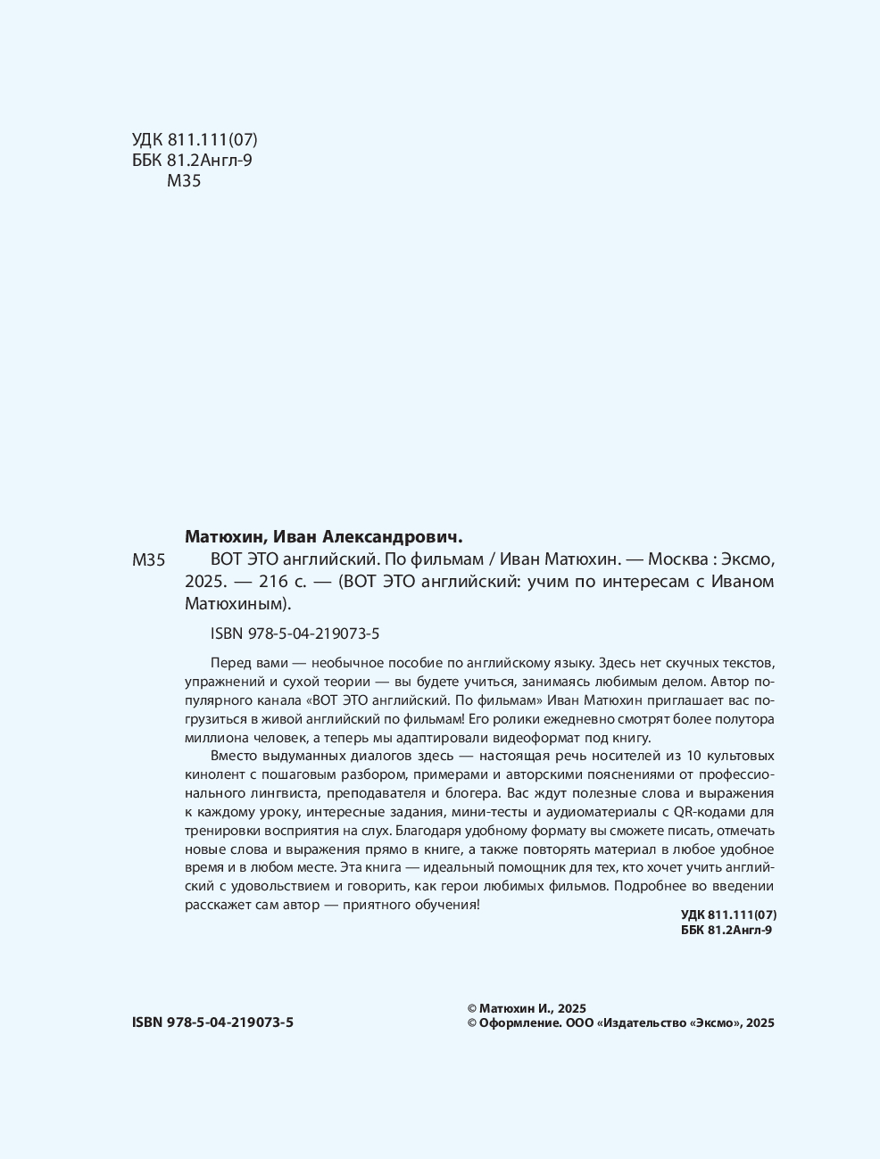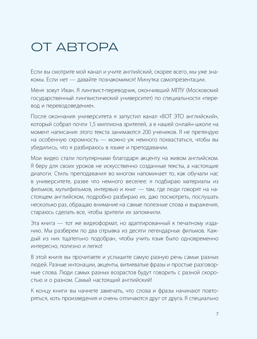 Перед вами – не обычное пособие по английскому языку. Здесь нет скучных текстов, упражнений и сухой теории – вы будете учиться, занимаясь любимым делом. Автор популярного канала "ВОТ ЭТО английский" Иван Матюхин приглашает вас погрузиться в живой английский по фильмам! Его ролики ежедневно смотрят более полутора миллиона человек, а теперь мы адаптировали видеоформат под книгу.