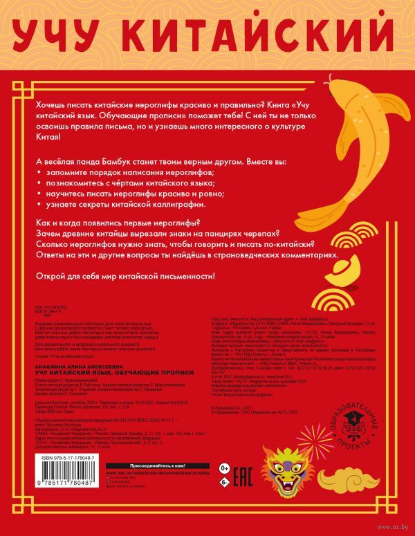 Хочешь писать китайские иероглифы красиво и правильно? Книга "Учу китайский язык. Обучающие прописи" поможет тебе! С ней ты не только освоишь правила письма, но и узнаешь много интересного о культуре Китая! А весёлая панда Бамбук станет твоим верным другом.