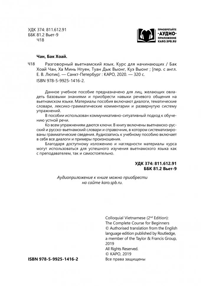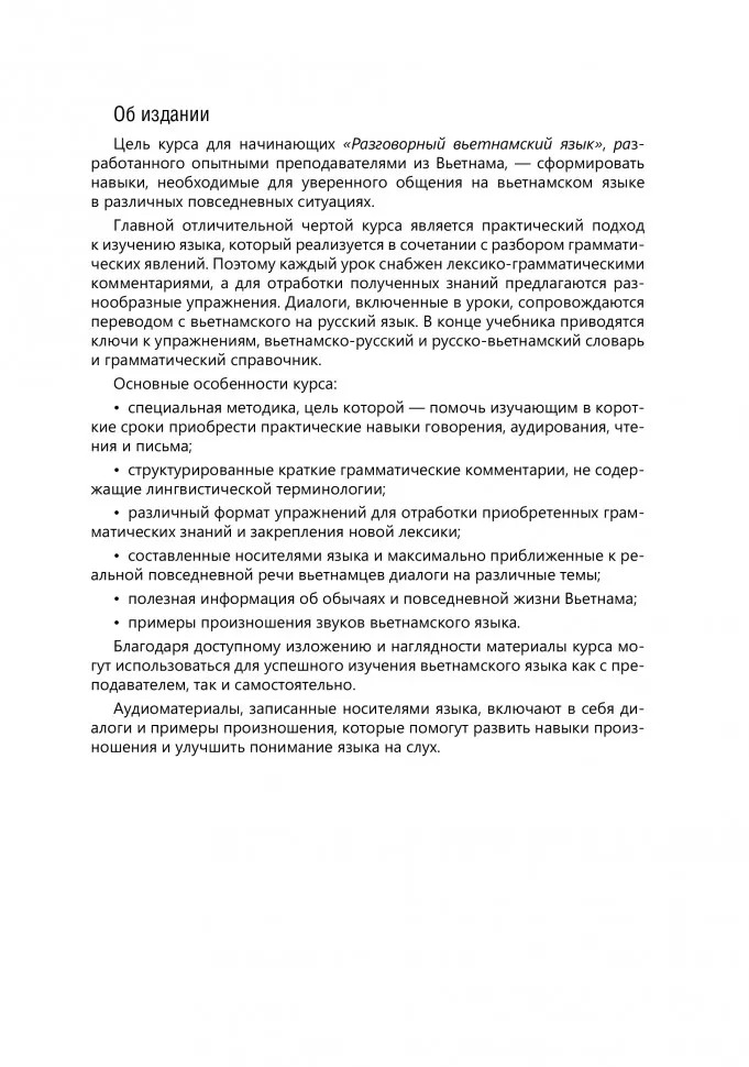 В книгу включены вьетнамско-русский и русско-вьетнамский словари и справочник, в котором систематизированы грамматические сведения. Аудиозапись к учебному пособию включает в себя все диалоги и примеры произношения.