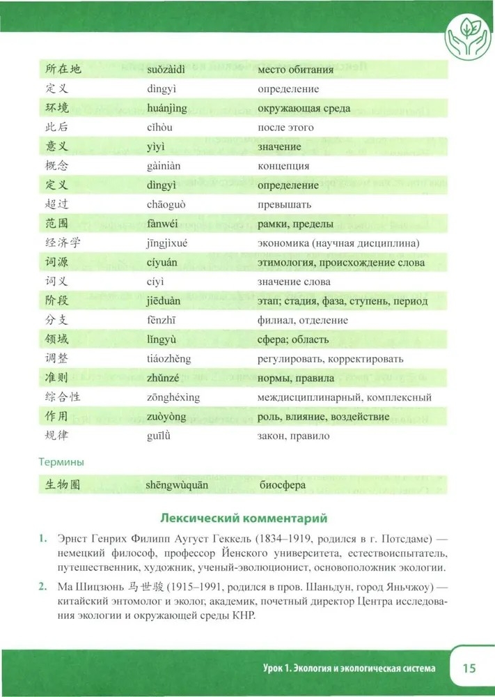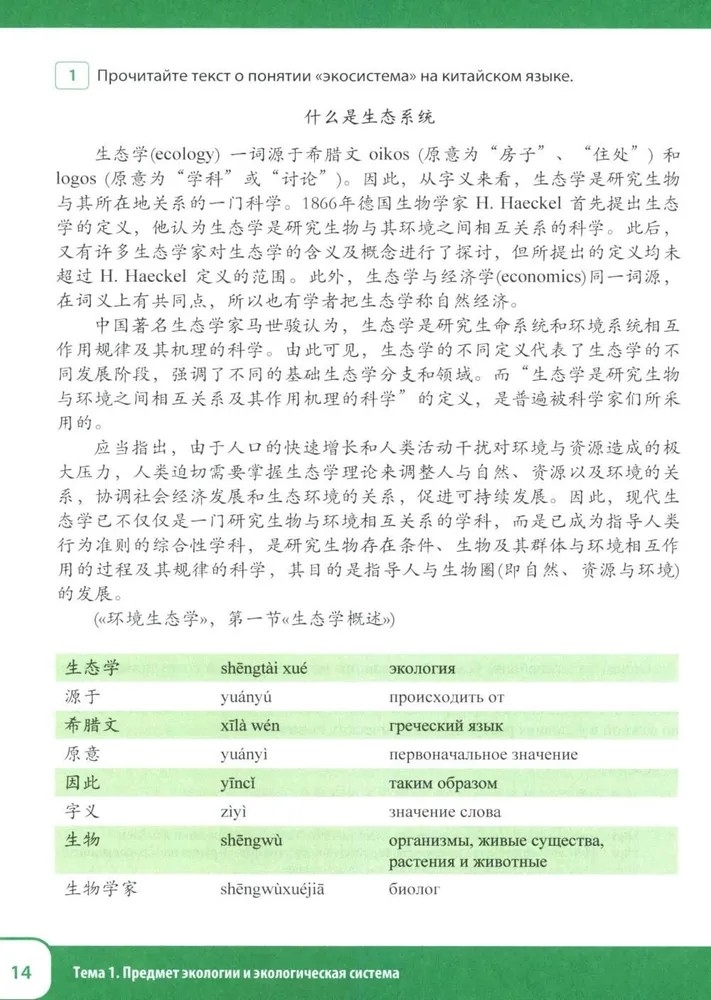 Учебное пособие предназначено для студентов, изучающих китайский язык по направлению 05.03.06 "Экология и природопользование" (профиль "Глобальная экологическая политика" и "Климатическая и экологическая безопасность"), а также может быть использовано преподавателями и студентами языковых и неязыковых вузов, реализующих программы обучения по экологическим специальностям.