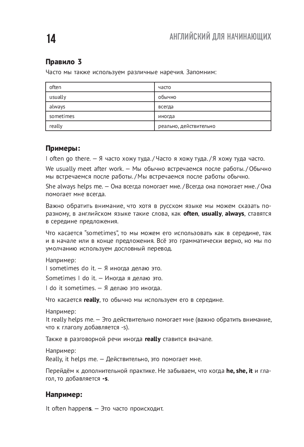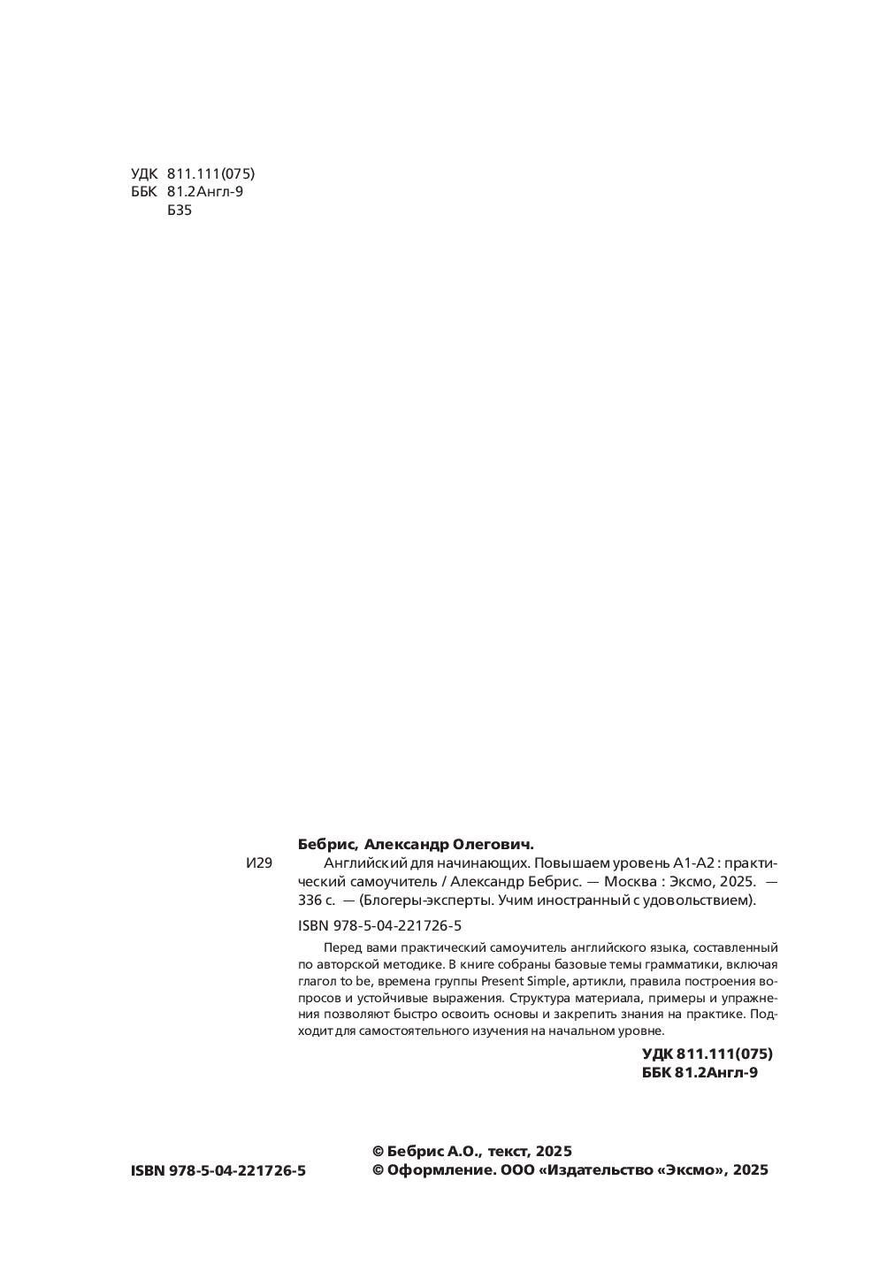 Эта книга – ваш персональный репетитор по самым важным темам: глагол to be, Present Simple, артикли, вопросы, устойчивые выражения. Всё объясняется чётко, пошагово и без перегрузки. Никакой воды – только то, что действительно нужно на старте.