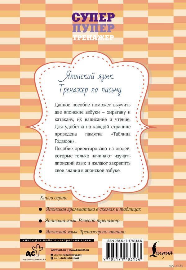 Данное пособие поможет выучить две японские азбуки – хирагану и катакану, их написание и чтение. Для удобства на каждой странице приведена памятка "Таблица Годзюон".