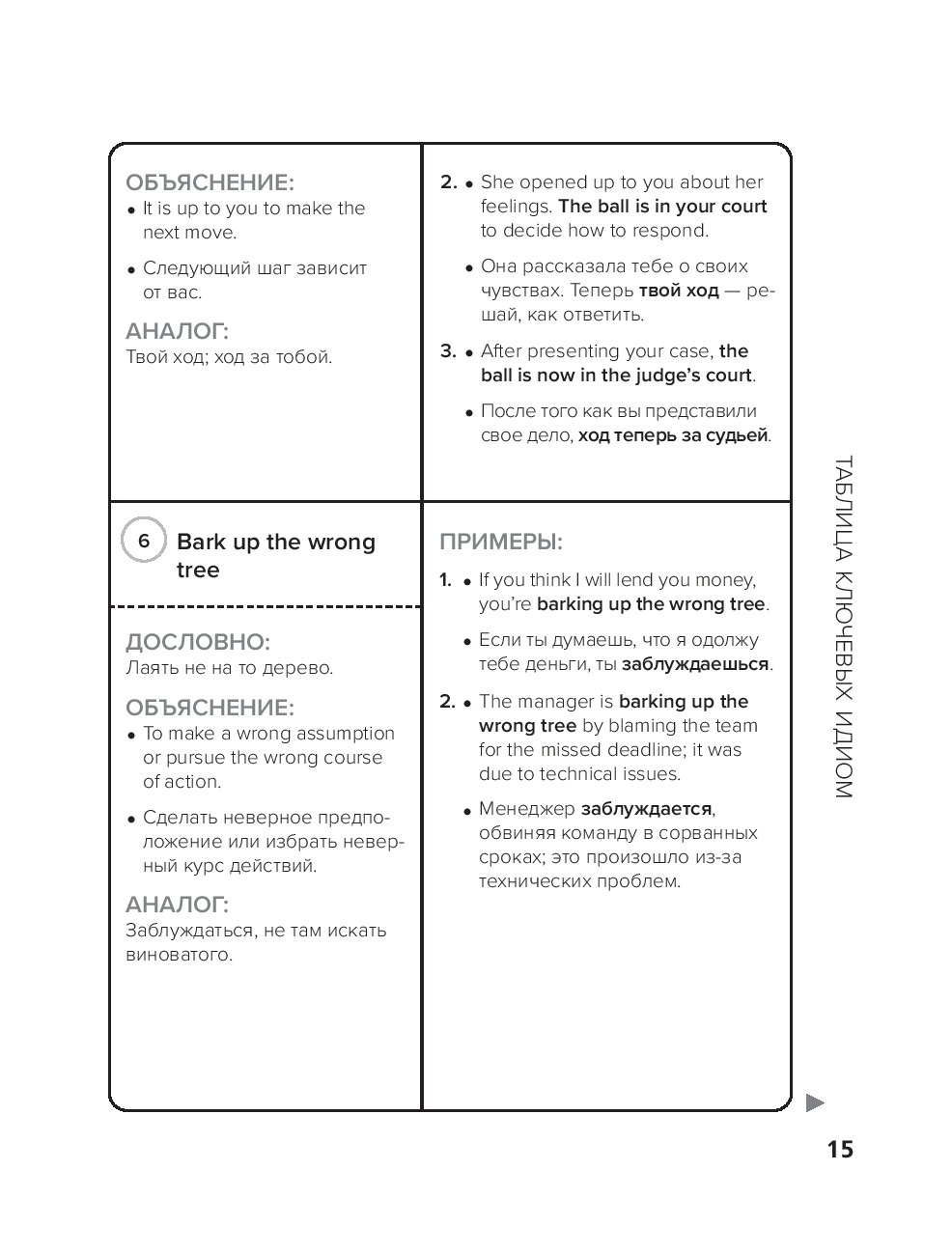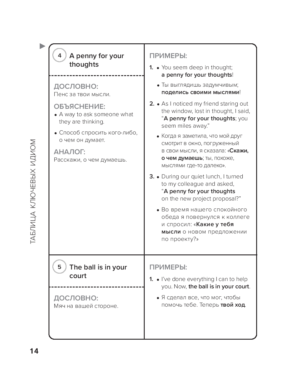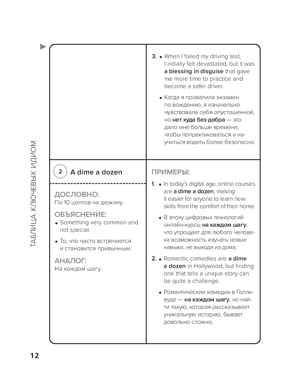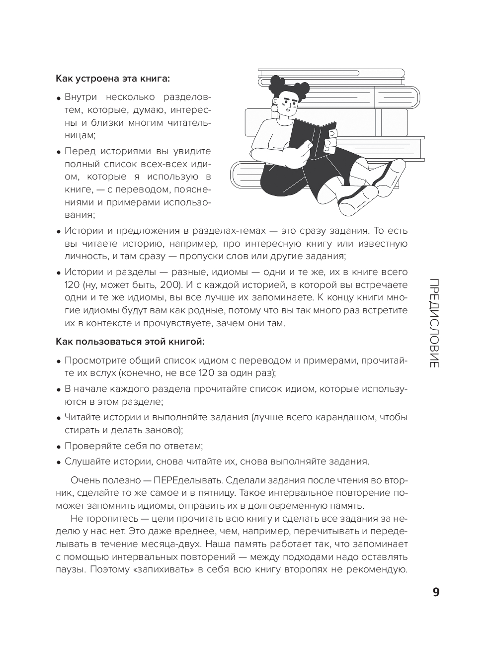 Книга состоит из общей таблицы всех идиом и практических упражнений на их отработку и запоминание через важные для каждого читателя темы. Таблица состоит из 120 идиом, включает в себя дословный перевод, русский эквивалент и примеры употребления идиом в реальной жизни. Блоки упражнений разделены по темам: семья и отношения, дети, ментальное здоровье и психология, путешествия и отдых, финансы и карьера, спорт и уход за собой, изучение языков и учеба. В конце каждого блока упражнений вас ждут трекеры для отслеживания прогресса.