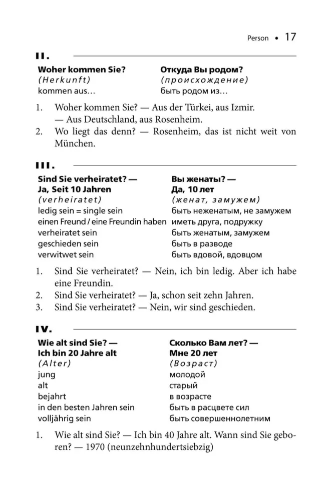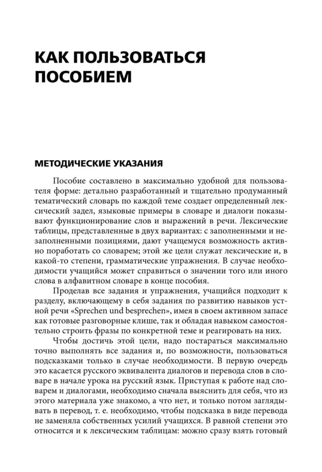 Предлагаемое пособие по интенсивному развитию устной речи имеет целью расширить и закрепить словарный запас учащихся, а также развить у них навыки говорения в рамках бытовых тем: Person, Familie, Wohnen, Essen und Trinken, Einkaufen, Fahrt/Flug, Freizeit, Urlaub/Ferien, Raumorientierung и Medizin. Пособие предназначено для лиц, владеющих начальными коммуникативными навыками на уровне А2 Общеевропейской языковой шкалы, и может быть рекомендовано учащимся старших классов и студентам, слушателям языковых курсов, а также тем, кто хочет самостоятельно изучить язык и говорить на нем.