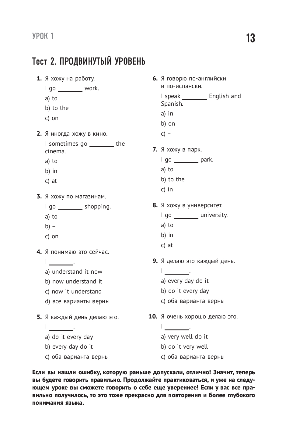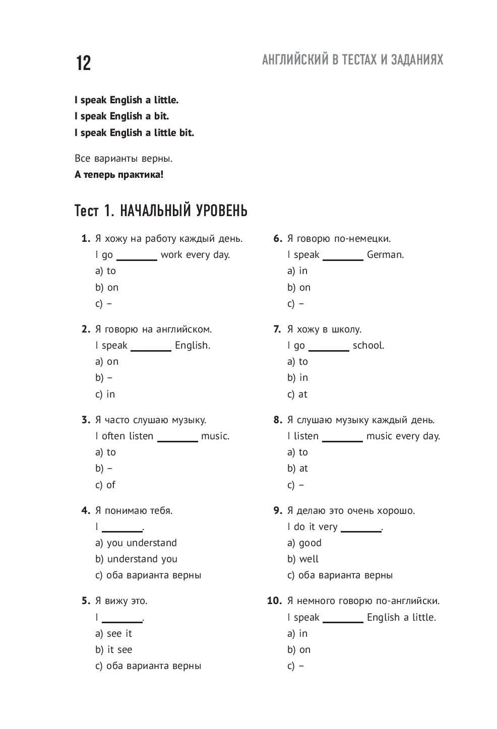 Этот сборник – практическое продолжение курса, которое помогает превратить знания в уверенные навыки. Вас ждут разнообразные тесты и задания, созданные для того, чтобы закрепить пройденный материал, натренировать грамматику и расширить словарный запас. Если вы хотите проверить свои силы и почувствовать реальный прогресс, эта книга станет надежным инструментом на пути к свободному английскому.