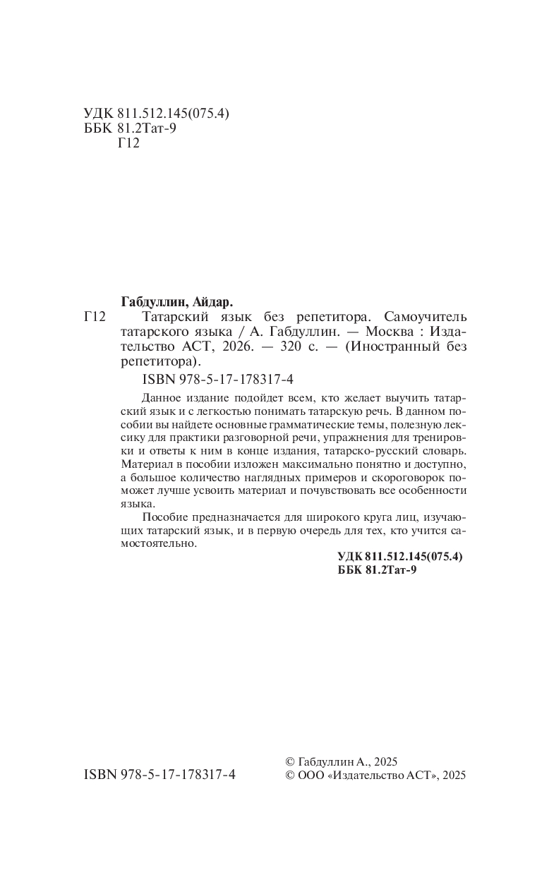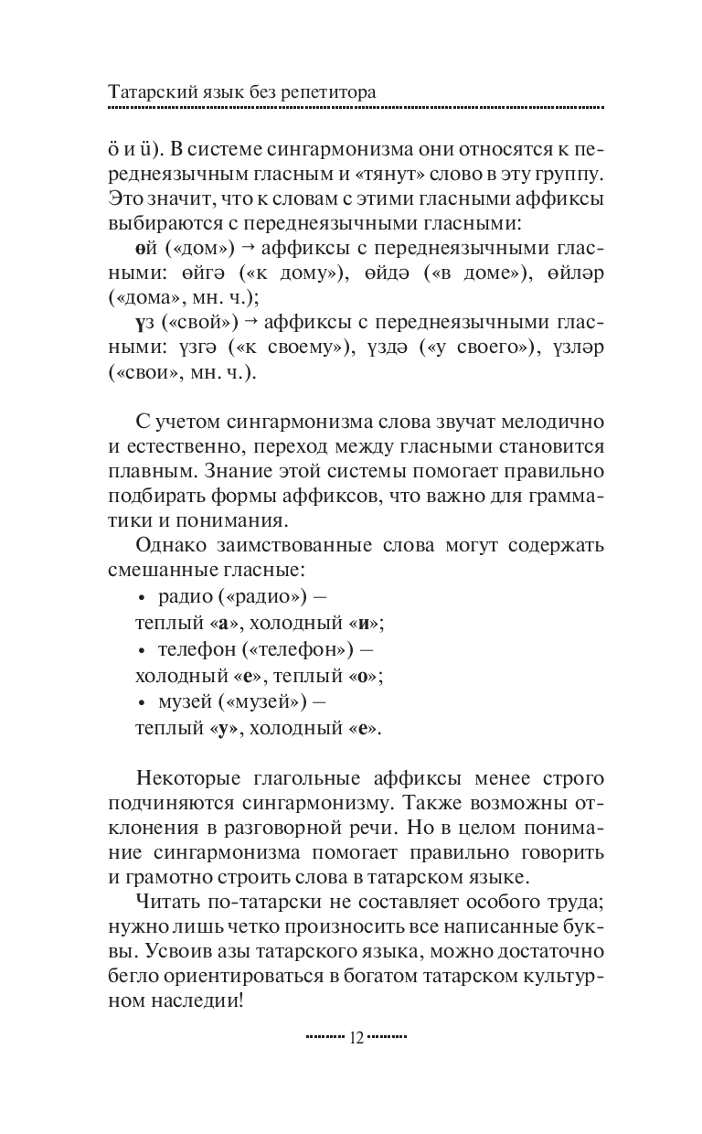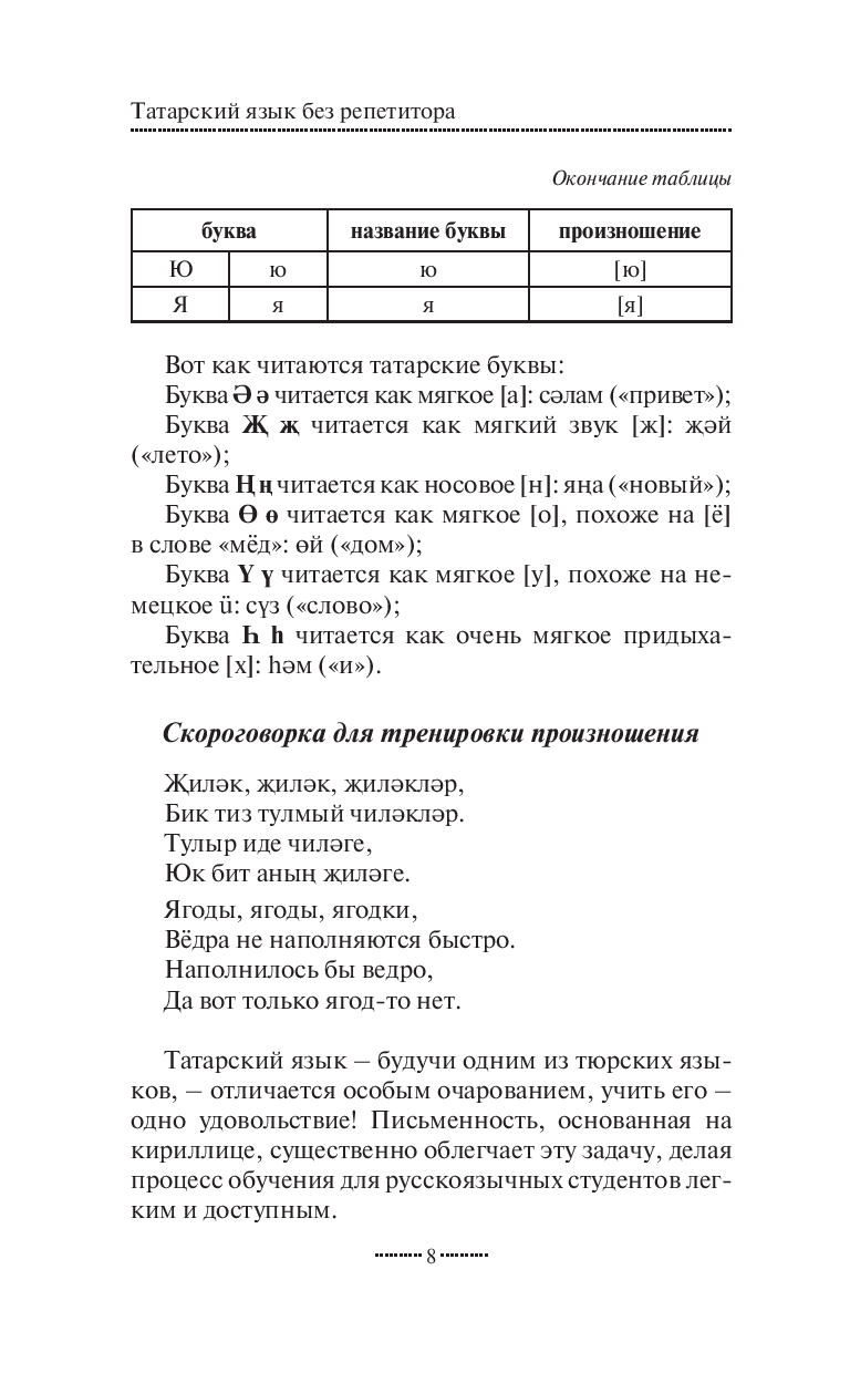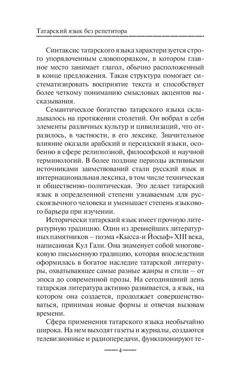 Пособие предназначается для широкого круга лиц, изучающих татарский язык, и в первую очередь для тех, кто учится самостоятельно.