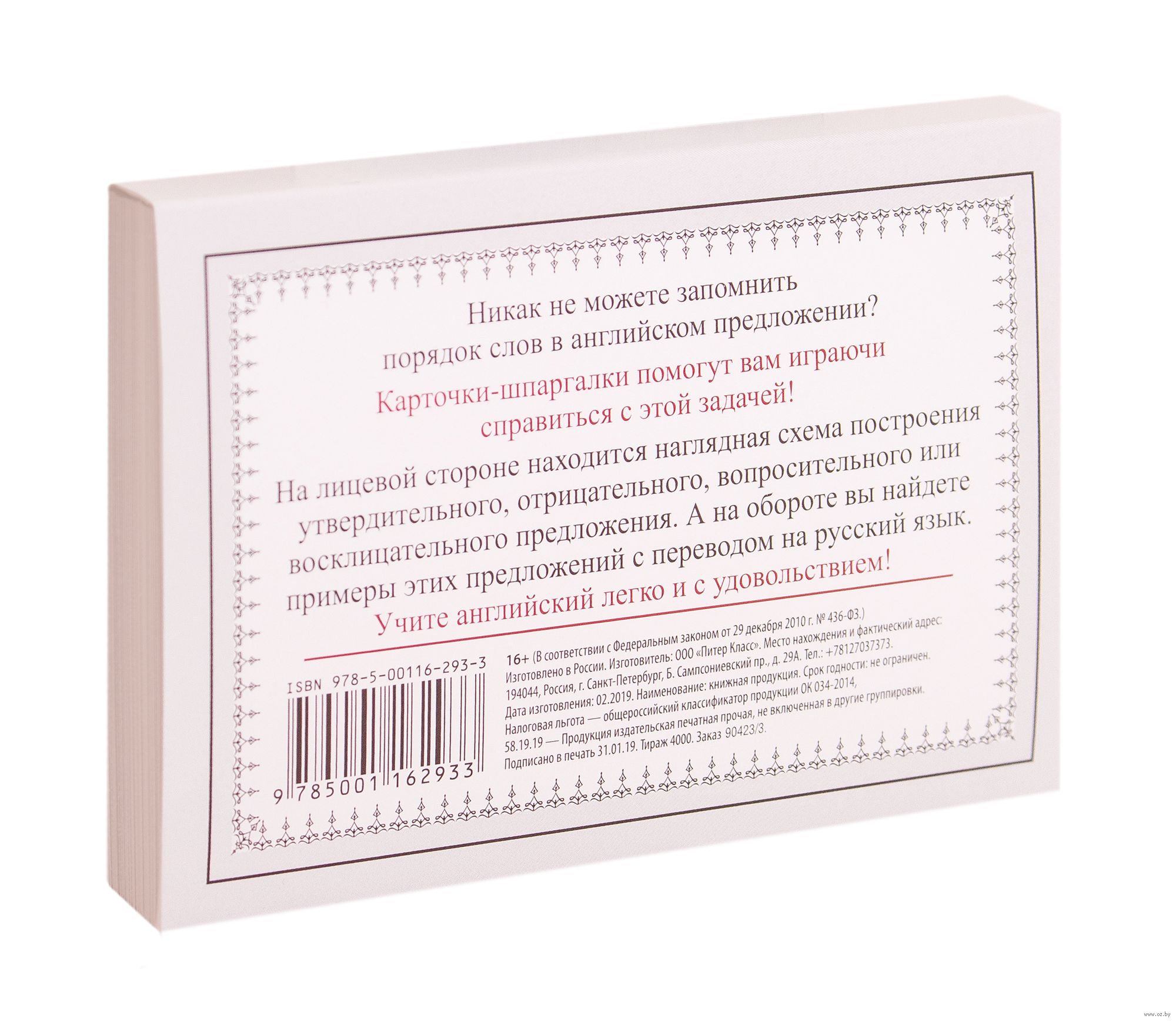 Никак не можете запомнить порядок слов в английском предложении? Карточки-шпаргалки помогут вам играючи справиться с этой задачей! На лицевой стороне находится наглядная схема построения утвердительного, отрицательного, вопросительного или восклицательного предложений. А на обороте вы найдете примеры этих предложений с переводом на русский язык. Учите английский легко и с удовольствием!