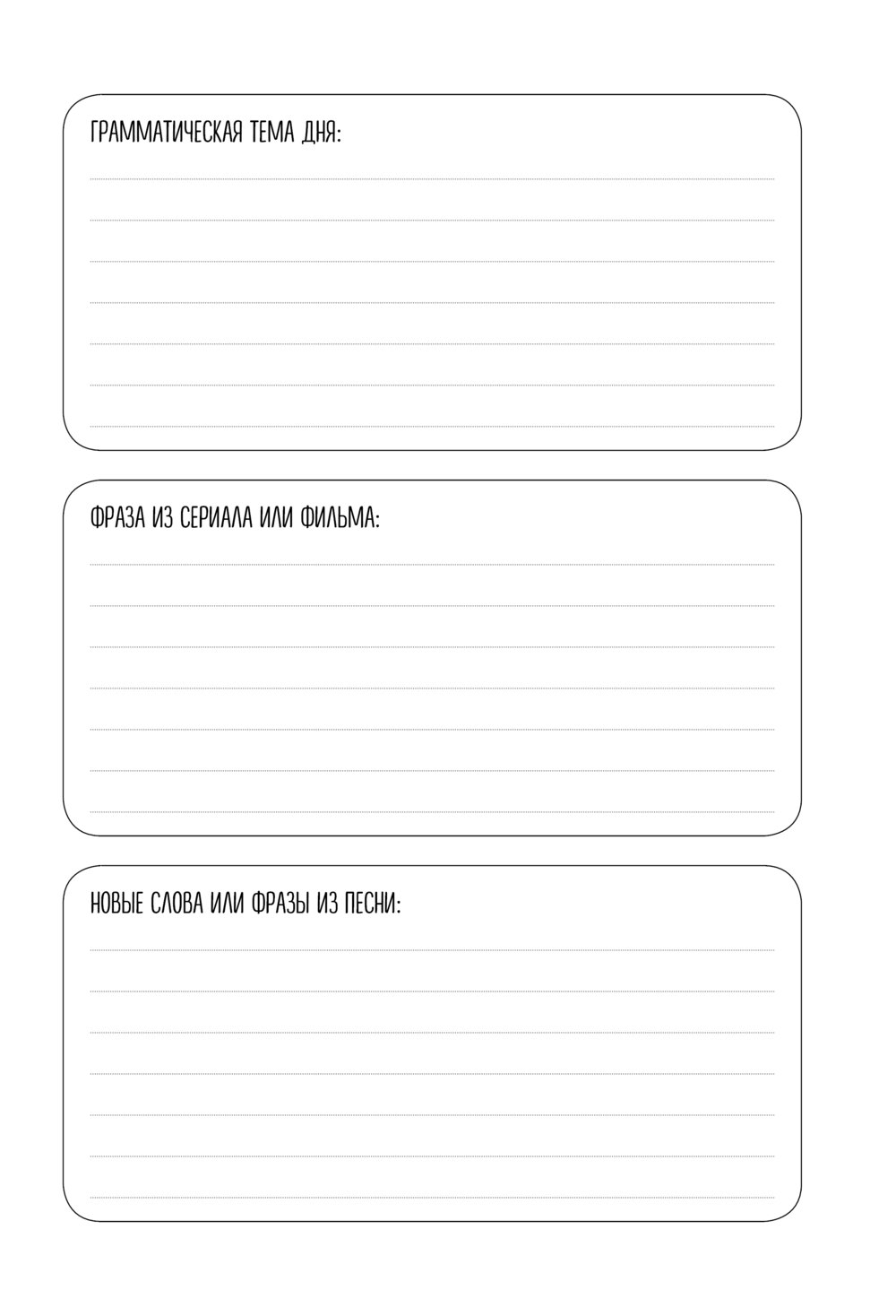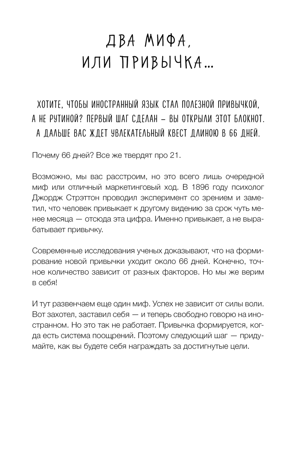 Следуйте инструкциям в блокноте, используйте трекер для наблюдений за прогрессом, старайтесь регулярно записывать новые слова и фразы из песен и фильмов. Заполнение каждого дня займет всего 15 минут! И не забывайте про систему поощрений. Удобный формат, плотная белая бумага и стильное оформление сделают обучение приятным.