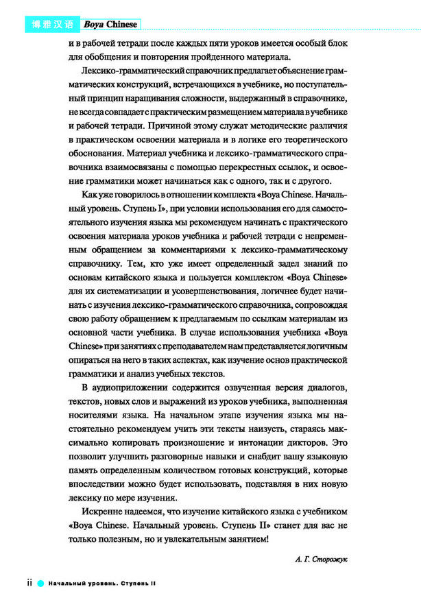 "Boya" – результат многолетней работы экспертов Пекинского университета. Издание на русском языке подготовлено специалистами Восточного факультета СПбГУ с учетом опыта традиций преподавания китайского языка в России. По сравнению с оригинальным учебником русское издание существенно дополнено грамматическими комментариями, новыми упражнениями, словарем и ключами к упражнениям.