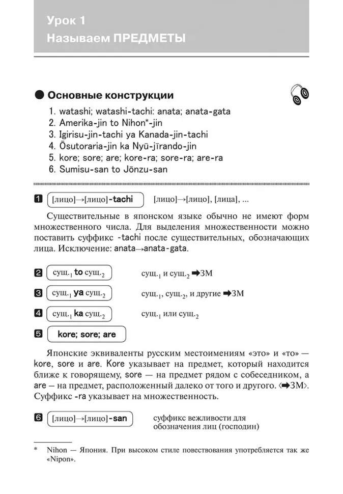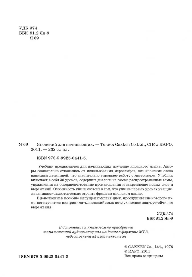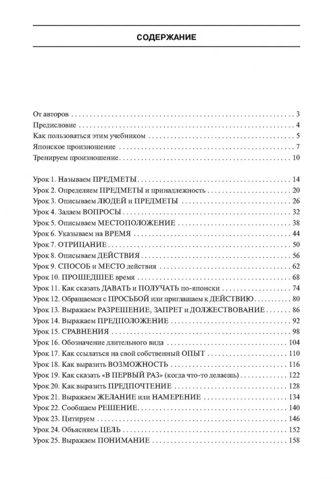Учебник предназначен для начинающих изучение японского языка. Авторы сознательно отказались от использования иероглифов, все японские слова написаны латиницей, что значительно упрощает работу с материалом. Учебник включает в себя 30 уроков, содержит диалоги на самые распространенные темы, упражнения на совершенствование произношения и закрепление новых слов и выражений. Особенность книги состоит в том, что уже на первых уроках учащиеся начинают самостоятельно строить фразы на японском языке.
