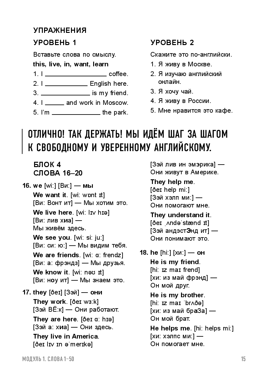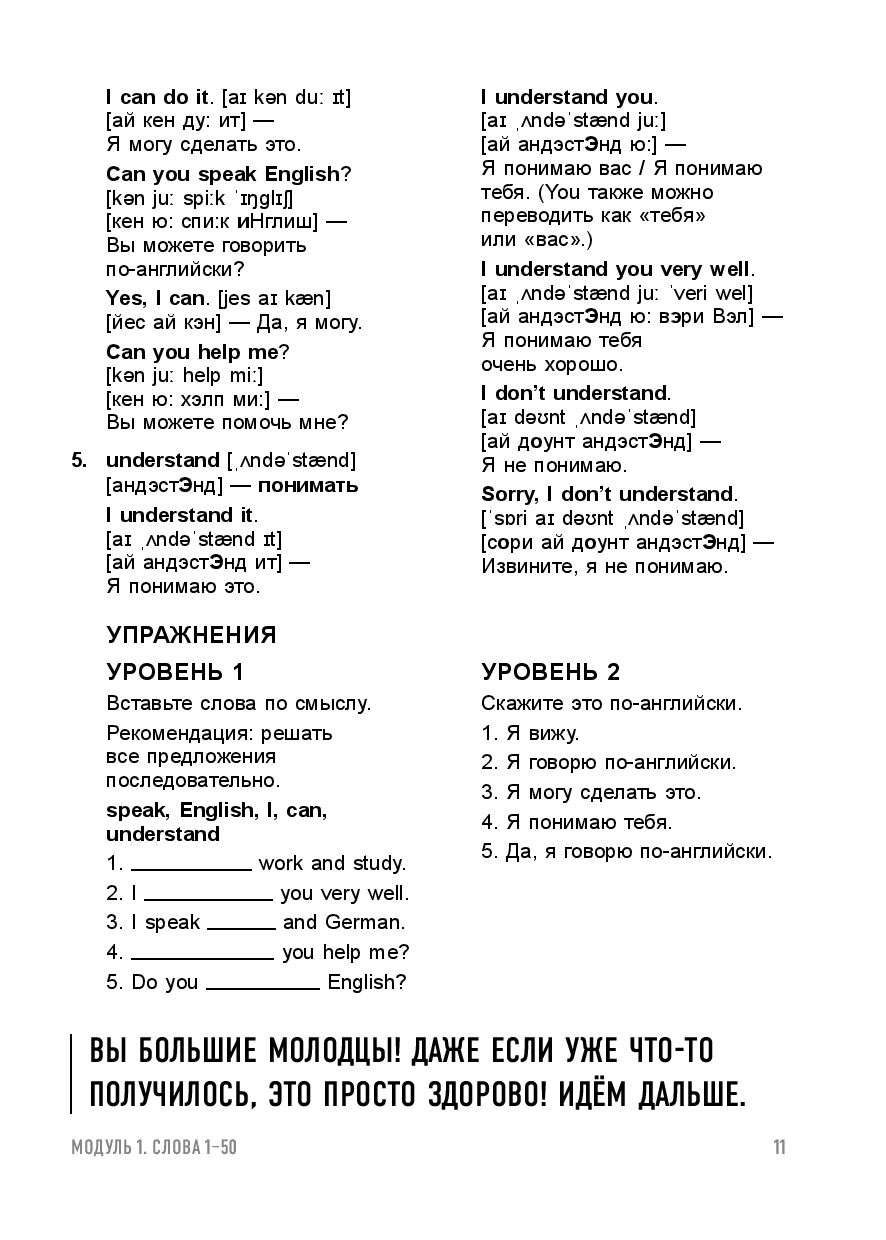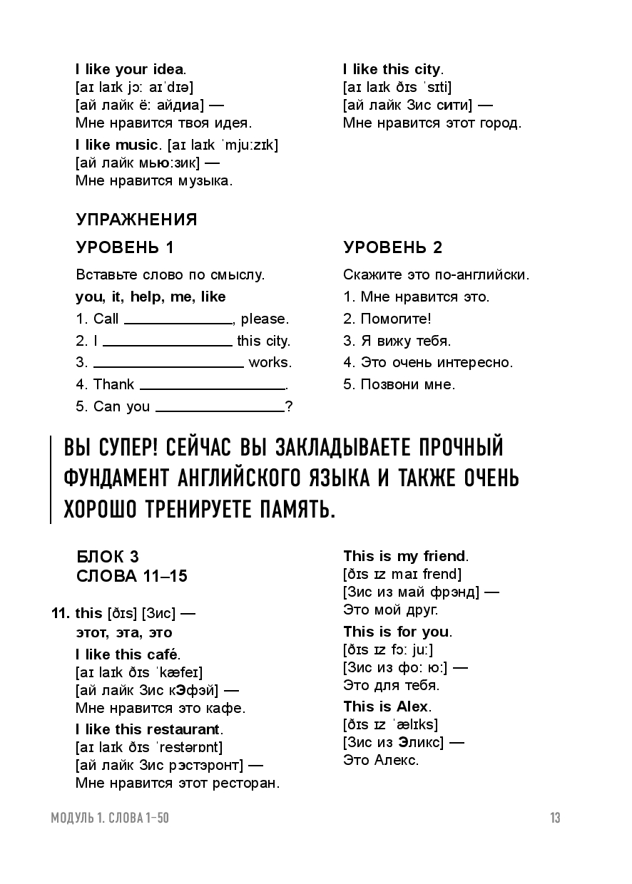 Пособие предназначено для уровня А0-А1. Курс построен по принципу "от простого к сложному" и охватывает до 90% повседневного общения: путешествия, работа, покупки, встречи, диалоги. Вы не заучиваете отдельные слова – а сразу учитесь строить фразы и предложения, как в живой речи.