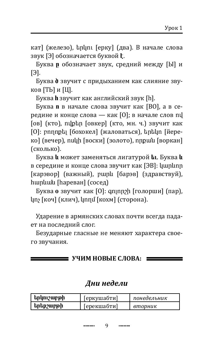 В каждом уроке есть лексика для заучивания, упражнения с ключами. В конце книги предлагаются краткие армянско-русский и русско-армянский словари.