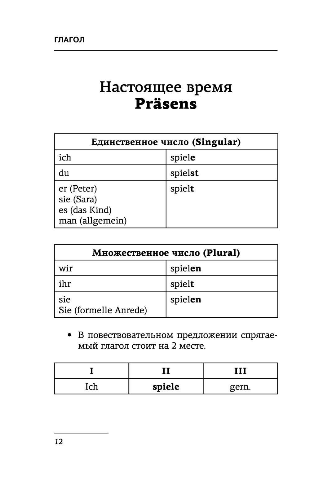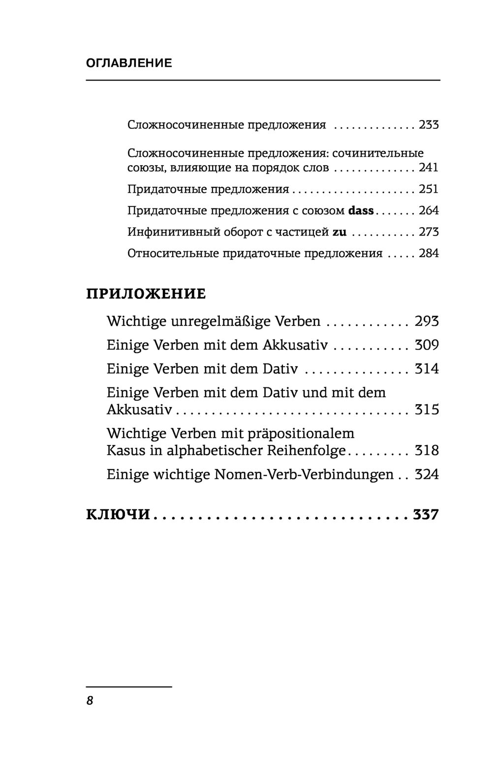Это издание поможет освоить все основные темы немецкой грамматики: особенности глаголов, существительных и артиклей, прилагательных, наречий, местоимений, предлогов, а также правила построения различных типов предложений и употребления Konjunktiv II. К каждой теме даны упражнения для тренировки и закрепления материала. В конце книги вы найдете ключи к упражнениям, а также списки неправильных глаголов и глаголов с управлением.