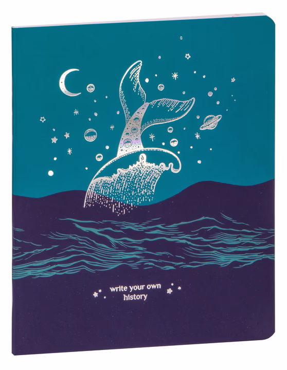 Обложка выполнена из мелованного картона с "soft-touch" ламинацией и тиснением голографической фольгой. Тетрадь идет с цветными форзацами.