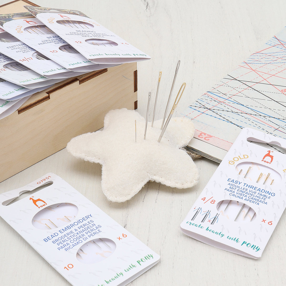 Иголки для шитья PONY "Crewels" – качественные иглы с золотым ушком, которые были разработаны с использованием запатентованной технологии. Прочные и гладкие иглы предназначены для различных видов шитья, включая ремонт одежды, штопку, рукоделие, а также вышивку гладью и другими техниками.