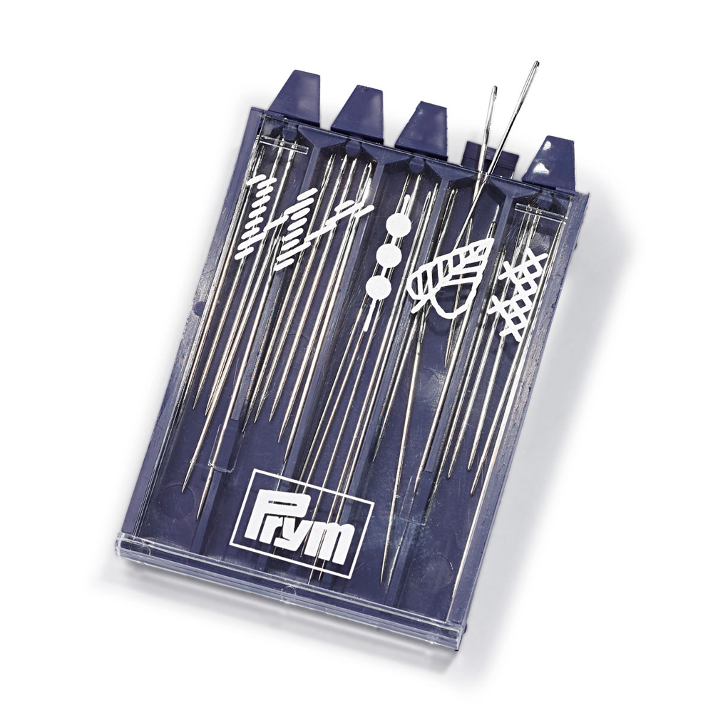 Иглы упакованы в контейнер с пятью отдельно закрывающимися отделениями. На прозрачной крышке над каждым отделением изображены символы для различных видов вышивания. Благодаря этому иглы всегда можно правильно распределить и отсортировать.