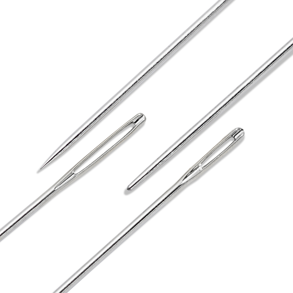 Благодаря тонкому и хорошо отшлифованному острию игла легко проходит через любые ткани, не повреждая структуру волокон. Ушко иглы имеет особое строение, что позволяет не пользоваться наперстком, настолько легко игла входит в ткань.