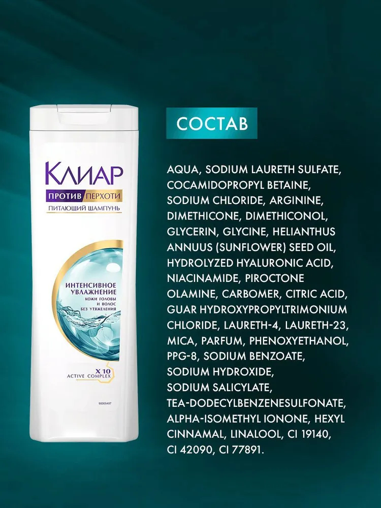 Aqua, Sodium Laureth Sulfate, Cocamidopropyl Betaine, Dimethiconol, Zinc Pyrithione, Dimethicone, Sodium Chloride, Parfum, Carbomer, Sodium Hydroxide, DMDM Hydantoin, Citric Acid, Guar Hydroxypropyltrimonium Chloride, TEA-Dodecylbenzenesulfonate, Zinc Sulfate, PPG-12, TEA-sulfate, Poloxamer 407, Laureth-23, Laureth-4, Glycerin, Panthenol, Cyclopentasiloxane, Sodium Benzoate, Sodium Polynaphthalenesulfonate, Helianthus Annuus (Sunflower) Seed Oil, PEG-9M, Xanthan Gum, Tocopheryl Acetate, Lysine hydrochloride, Methylisothiazolinone, Cellulose Gum, Pantolactone, Pyridoxine HCl, Sodium Ascorbyl Phosphate, Ozonized Pereskia Grandifolia Callus Culture Extract, Methylchloroisothiazolinone, Phenoxyethanol, Butylphenyl Methylpropional, Hexyl Cinnamal, Linalool, CI 47005, CI 42090.Мы используем файлы cookie для обеспечения удобства работы с сайтом и его контакта с пользователем.