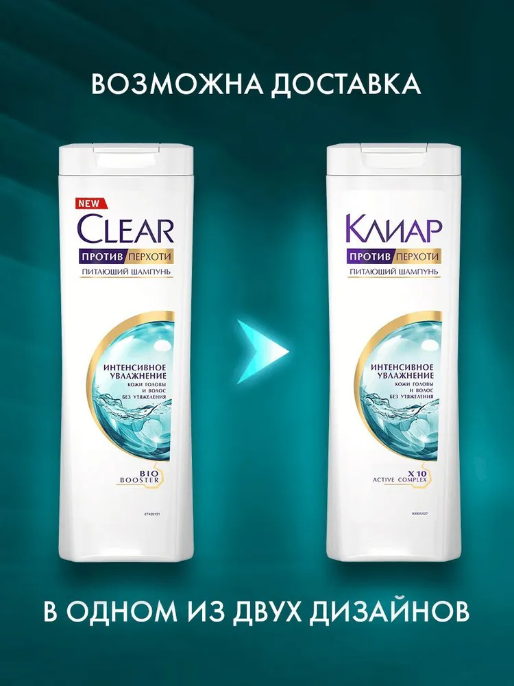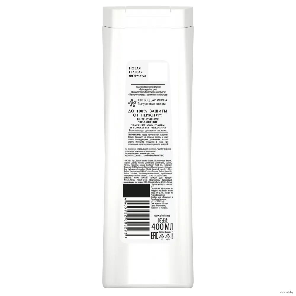 Женский шампунь против перхоти Clear Интенсивное увлажнение, обогащенный гиалуроновой кислотой эффективно удаляет перхоть и увлажняет волосы, в условиях ежедневного использования фена, выпрямителя для волос и различных укладочных средств, которые сушат волосы и кожу головы, способствуя появлению перхоти.