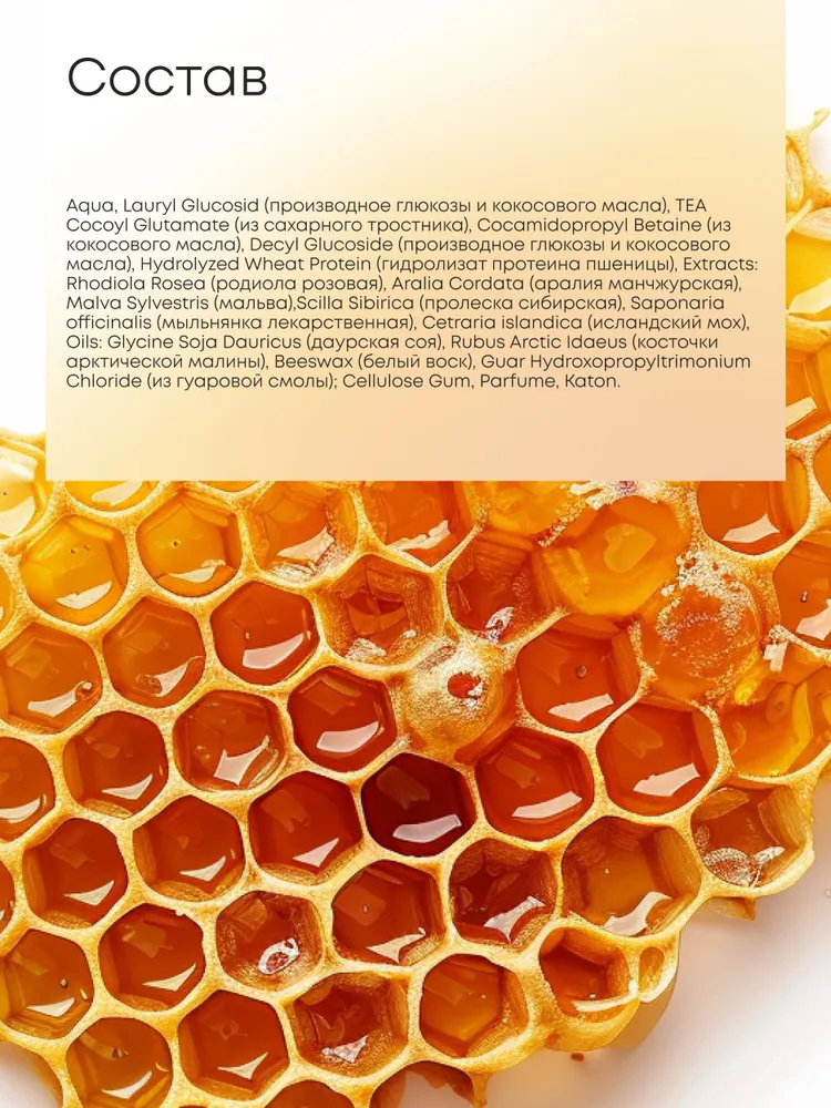 Aqua, lauryl glucosid (производное глюкозы и кокосового масла), tea cocoyl glutamate (из сахарного тростника), cocamidopropyl betaine (из кокосового масла), decyl glucoside (производное глюкозы и кокосового масла), hydrolyzed wheat protein (гидролизат протеина пшеницы), extracts: rhodiola rosea (родиола розовая), aralia cordata (аралия манчжурская), malva sylvestris (мальва),scilla sibirica (пролеска сибирская), saponaria officinalis (мыльнянка лекарственная), cetraria islandica (исландский мох), oils: glycine soja dauricus (даурская соя), rubus arctic idaeus (косточки арктической малины), beeswax (белый воск), guar hydroxopropyltrimonium chloride (из гуаровой смолы); cellulose gum, parfume, katon.