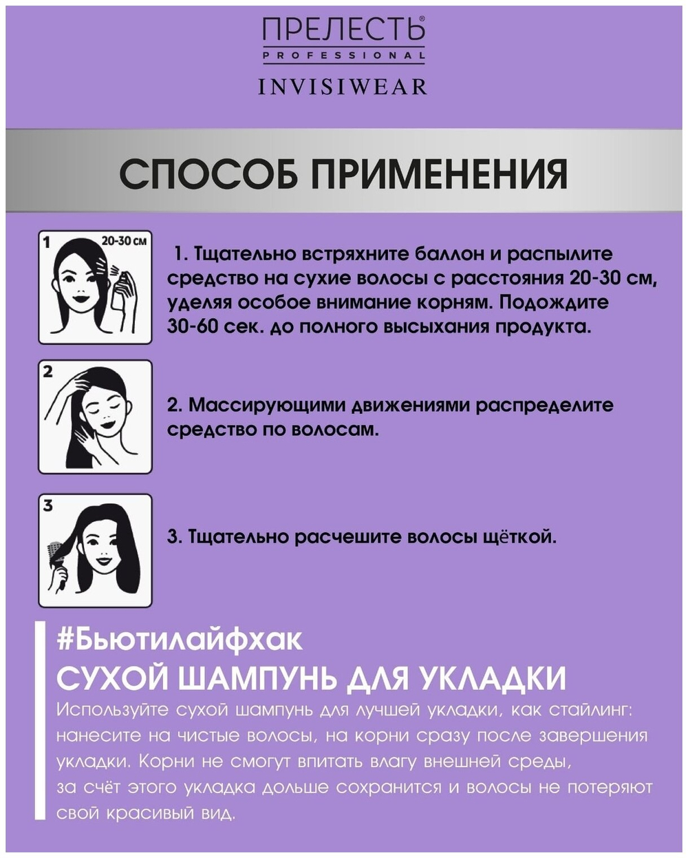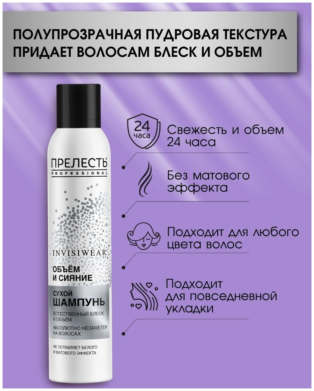 Экспресс-средство для очищения волос и увеличения объема. С его помощью можно за 5 минут привести волосы в порядок, убрав жирный блеск с волос и головы. Сухой шампунь полностью вычесывается, не оставляет белых следов на одежде и волосах. После его применения прическа сохраняет свежесть и объем до 24 часов.
