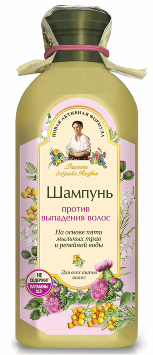 Шампунь против выпадения на основе пяти мыльных трав и репейного настоя для всех типов волос.