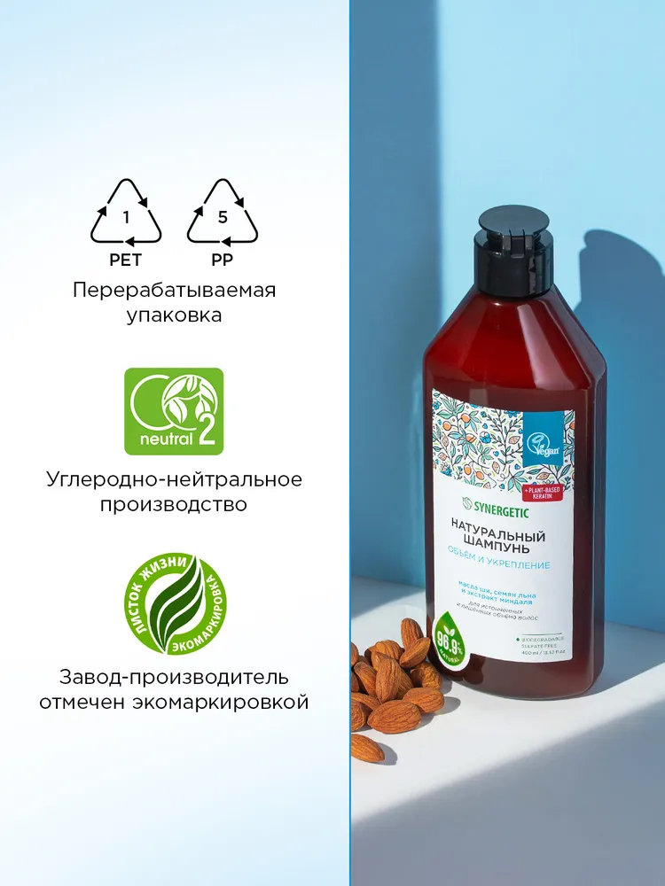 Натуральный шампунь содержит комплекс масел ши и семян льна, который питает тонкие ослабленные волосы и увеличивает объем. Активные компоненты в составе шампуня укрепляют волосы и стимулируют восстановление кератиновых волокон. Экстракты миндаля и маракуйи придают волосам эластичность и блеск.