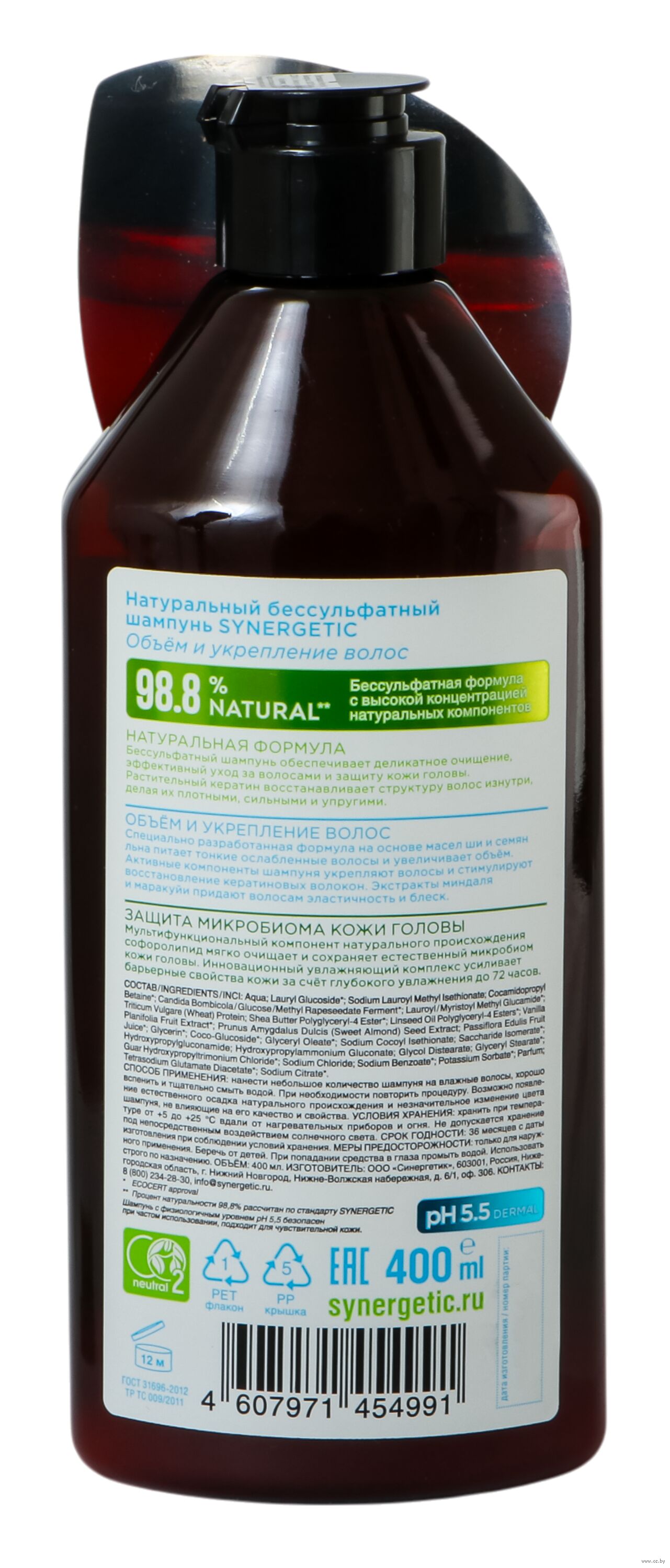Бессульфатный шампунь "Объем и укрепление" – эффективное средство для очищения кожи головы и истонченных, лишенных объема волос – более чем на 98% состоит из натуральных компонентов.