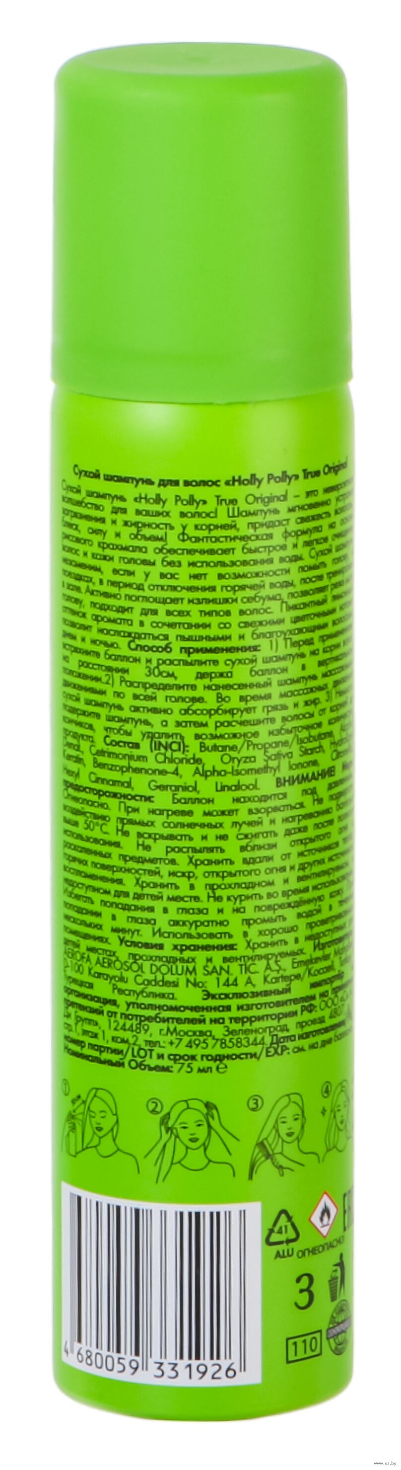 Перед применением встряхните баллон. Распылите сухой шампунь на корни волос с расстояния 30 см, держа баллон вертикально. Распределите шампунь массажными движениями по всей голове. Немного подождите, а затем расчешите волосы от корней до кончиков, чтобы удалить избыточное количество продукта.Состав