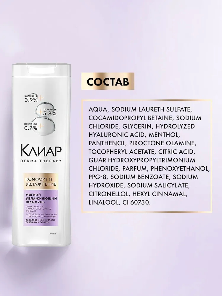 Aqua, sodium laureth sulfate, cocamidopropyl betaine, sodium chloride, glycerin, hydrolyzed hyaluronic acid, menthol, panthenol, piroctone olamine, tocopheryl acetate, citric acid, guar hydroxypropyltrimonium chloride, parfum, phenoxyethanol, ppg-8, sodium benzoate, sodium hydroxide, sodium salicylate, citronellol, hexyl cinnamal, linalool, ci 60730.Мы используем файлы cookie для обеспечения удобства работы с сайтом и его контакта с пользователем.