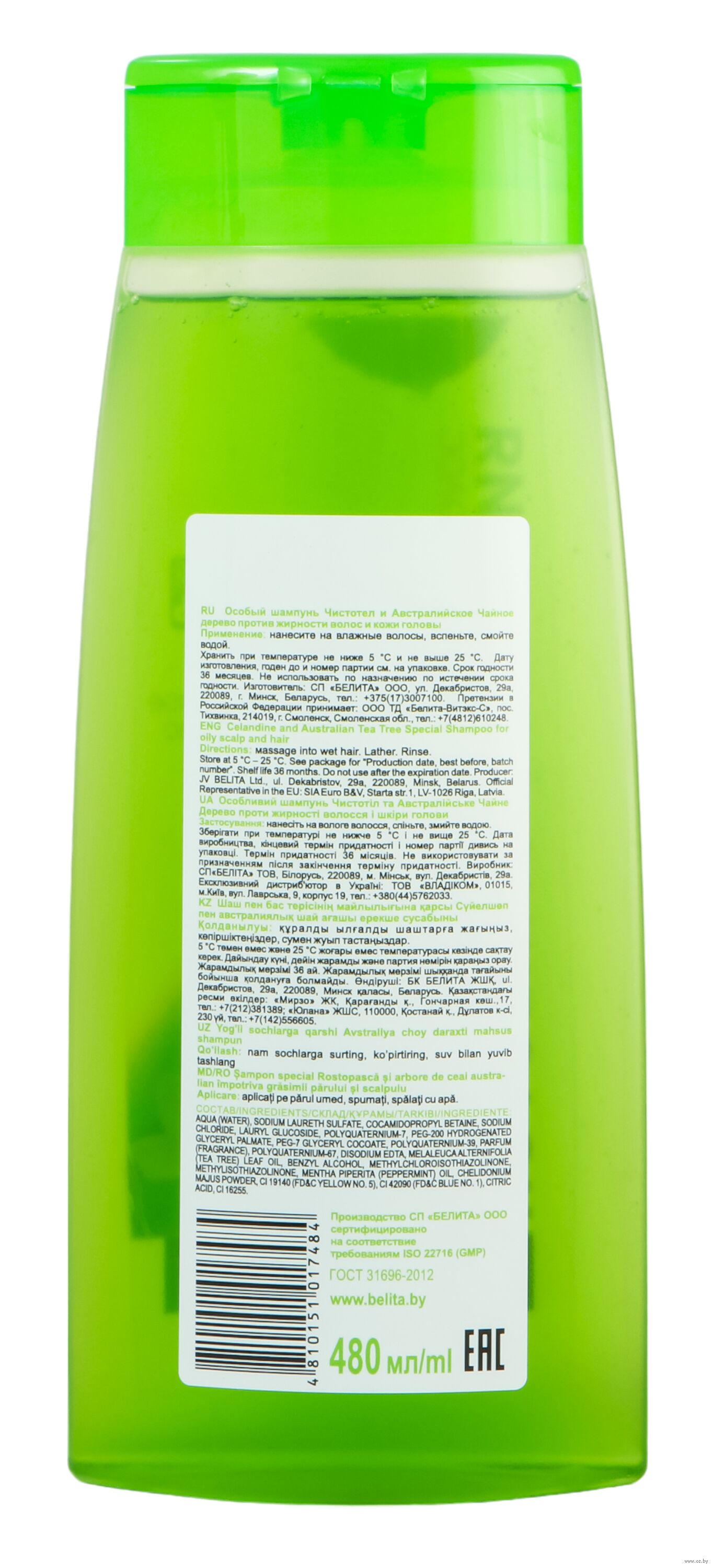 Особый шампунь против жирности волос и кожи головы Чистотел и австралийское чайное дерево эффективно очищает кожу и волосы, склонные к быстрому загрязнению. Обладает приятным естественным ароматом чайного дерева.