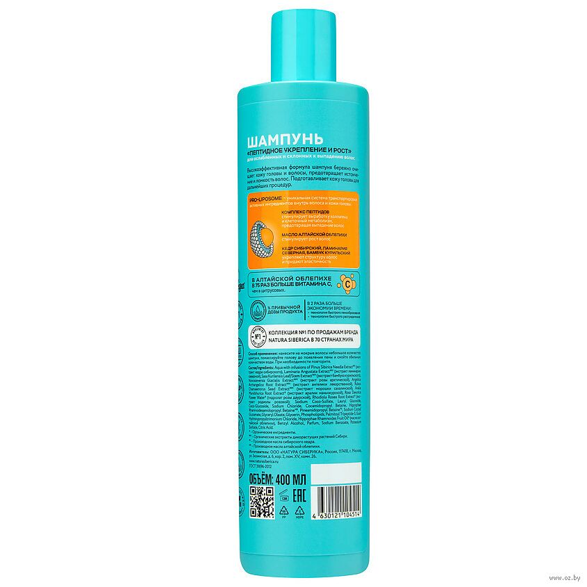 Aqua with infusions of Pinus Sibirica Needle ExtractWH (экстракт кедра сибирского), Laminaria Angustata ExtractWH (экстракт северной ламинарии), Sasa Kurilensis Leaf/Stem ExtractWH (экстракт бамбука курильского), Novosieversia Glacialis ExtractWH (экстракт розы арктической), Angelica Archangelica Root ExtractWH (экстракт ангелики лекарственной), Rubus Chamaemorus Seed ExtractWH (экстракт морошки сахалинской), Aralia Mandshurica Root Extract* (экстракт аралии маньчжурской), Rosa Davurica Flower Water* (гидролат розы даурской), Rhodiola Rosea Root Extract* (экстракт родиолы розовой); Sodium Coco-Sulfate, Lauryl Glucoside, Coco-Glucoside, Sodium Chloride, Cocamidopropyl Betaine, Hippophae Rhamnoidesamidopropyl BetaineHR, Pineamidopropyl BetainePS, Sodium Cocoyl Glutamate, Glyceryl Oleate, Glycerin, Phospholipids, Palmitoyl Tripeptide-5, Guar Hydroxypropyltrimonium Chloride, Hippophae Rhamnoides Fruit Oil* (масло алтайской облепихи), Benzyl Alcohol, Parfum, Sodium Benzoate, Potassium Sorbate, Citric Acid. * – органические ингредиенты WH – органические экстракты дикорастущих растений Сибири PS – производное масла сибирского кедра HR – производное масла алтайской облепихи