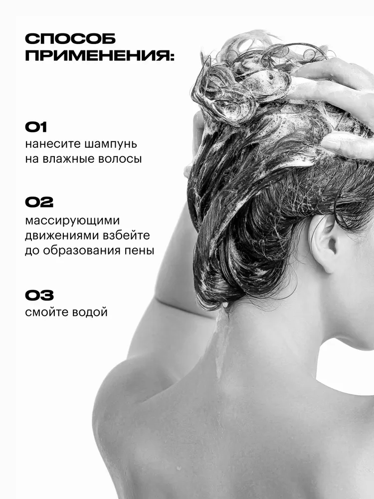 Нанести на влажные волосы, помассировать до образования устойчивой пены в течение 1-2 минут, тщательно смыть.Состав