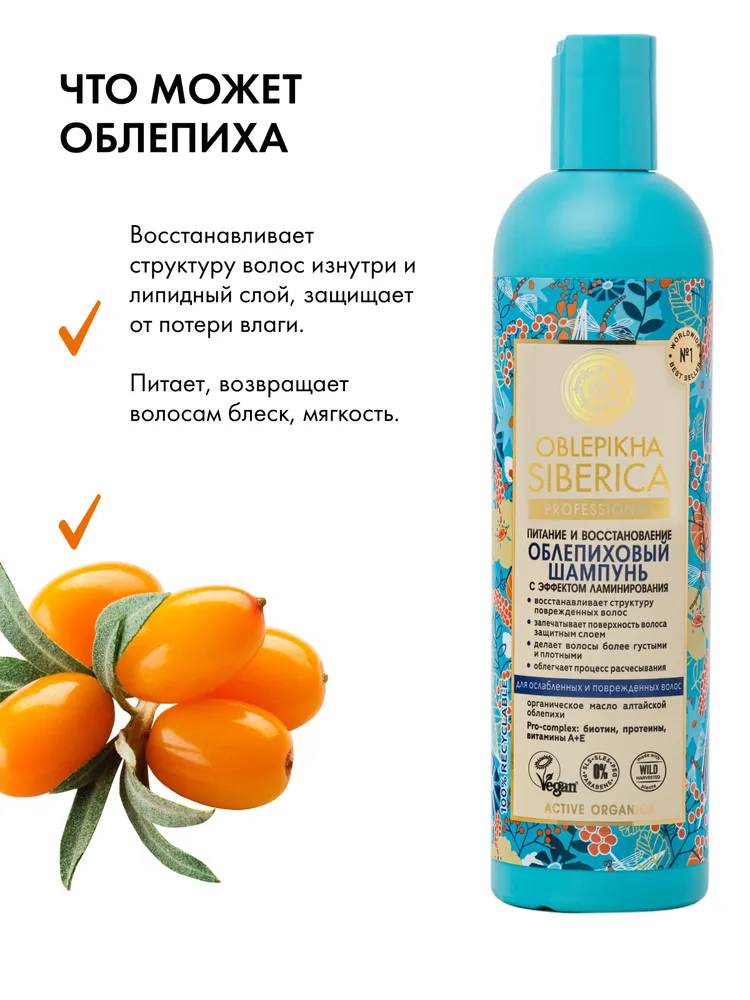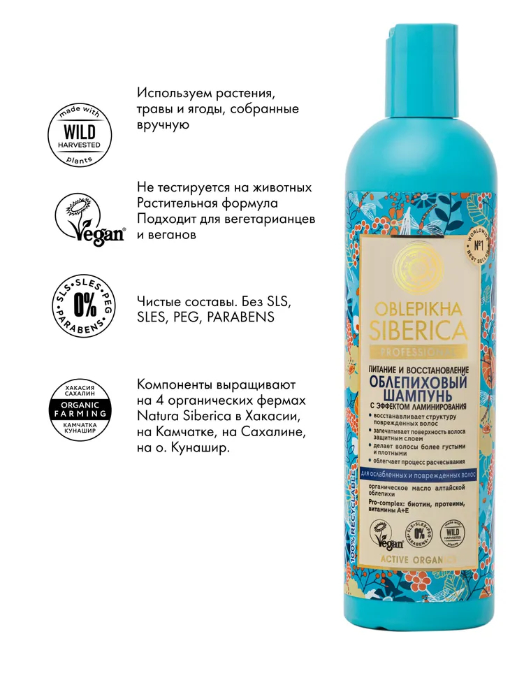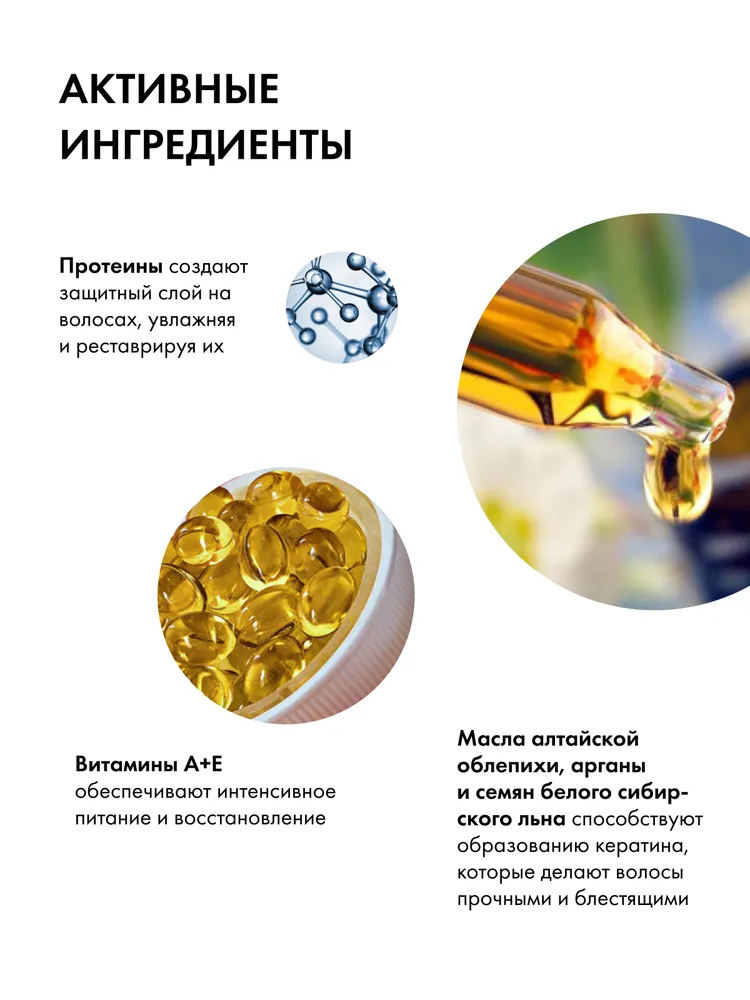 Деликатно очищает волосы, интенсивно восстанавливает их поврежденную структуру и защищает от термовоздействия при горячей укладке. Идеально подходит для ухода за ослабленными, окрашенными и мелированными волосами, а так же волос после химической завивки. Запечатывает поверхность волос защитным слоем, создавая эффект ламинирования, разглаживает и уплотняет их, облегчая процесс расчесывания. Входящие в состав шампуня витамины и аминокислоты питают и восстанавливают волосы. После применения шампуня волосы становятся заметно более гладкими, упругими и послушными. Масло алтайской облепихи и марокканское масло арганы способствуют образованию кератина, обеспечивающего волосам прочность и блеск. Масла семян сибирского льна и арктическая роза и цетрария снежная сохраняют влагу глубоко в структуре волос.