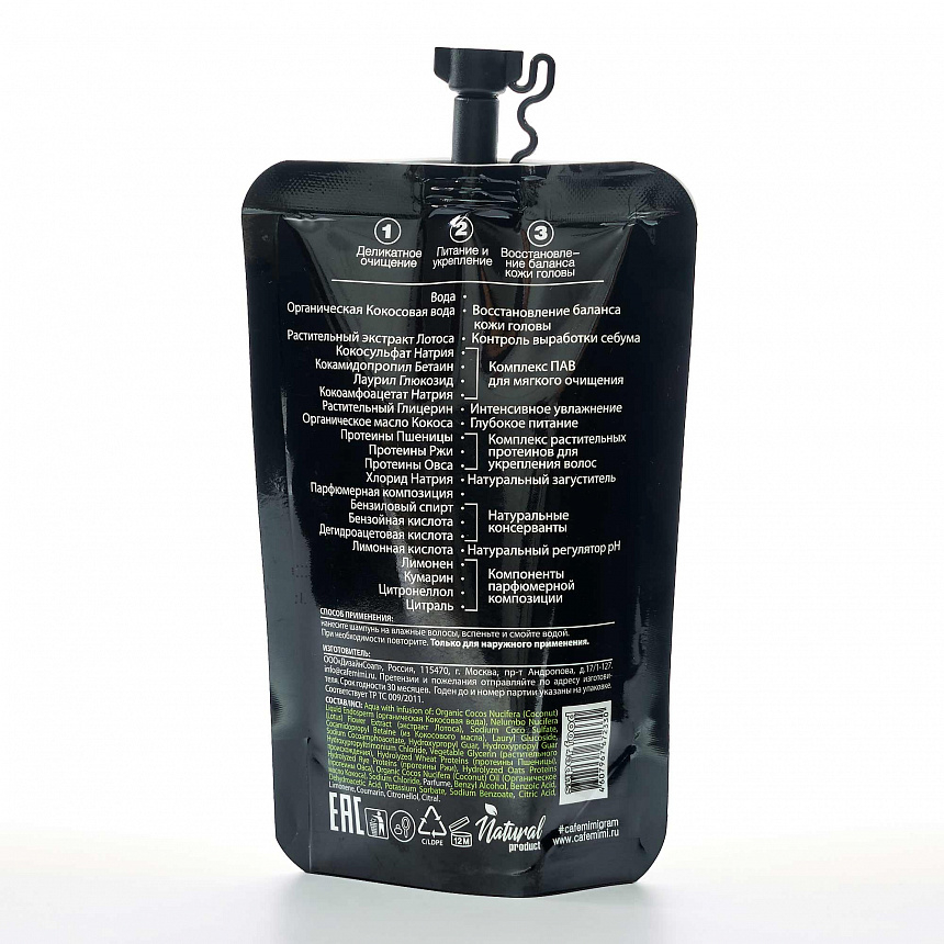 Aqua with infusion of: Organic Cocos Nucifera (Coconut) Liquid Endosperm (органическая Кокосовая вода), Nelumbo Nucifera (Lotus) Flower Extract (экстракт Лотоса), Sodium Coco Sulfate, Cocamidopropyl Betaine (из Кокосового масла), Lauryl Glucoside, Sodium Cocoamphoacetate, Hydroxypropyl Guar, Hydroxypropyl Guar Hydroxypropyltrimonium Chloride, Vegetable Glycerin (растительного происхождения), Hydrolyzed Wheat Proteins (протеины Пшеницы), Hydrolyzed Rye Proteins (протеины Ржи), Hydrolyzed Oats Proteins (протеины Овса), Organic Cocos Nucifera (Coconut) Oil (Органическое масло Кокоса), Sodium Chloride, Parfume, Benzyl Alcohol, Benzoic Acid, Dehydroacetic Acid, Potassium Sorbate, Sodium Benzoate, Citric Acid, Limonene, Coumarin, Citronellol, Citral.