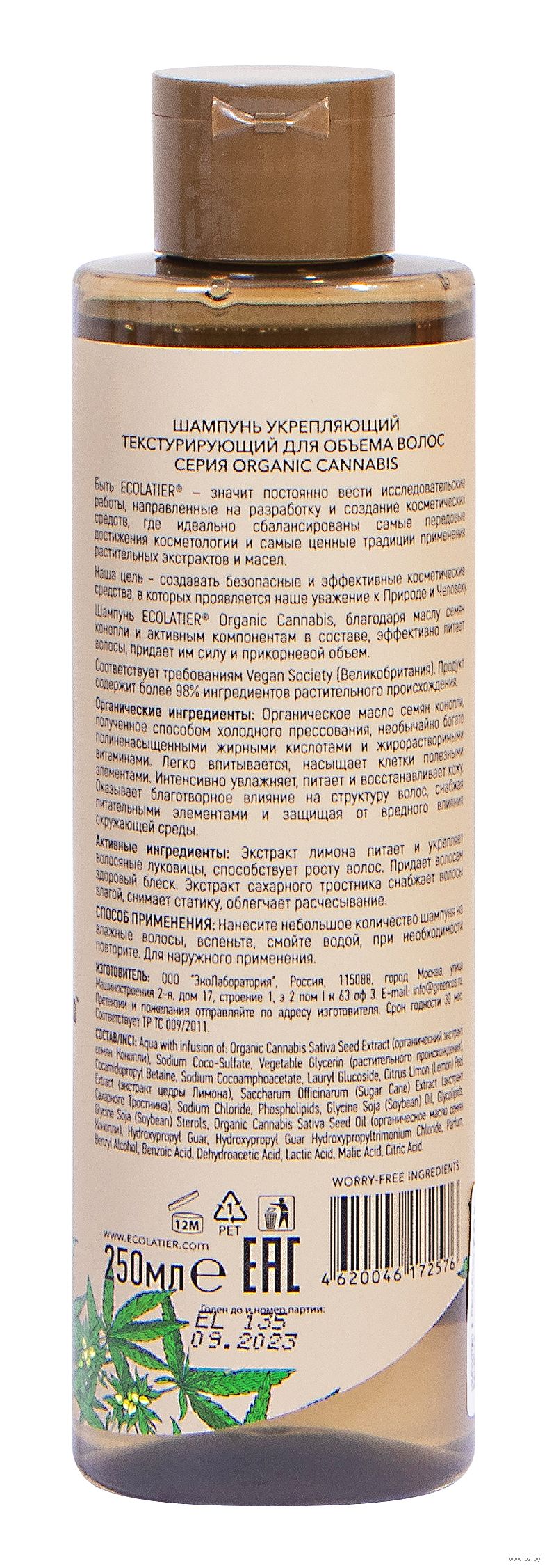 Aqua, Organic Cannabis Sativa Seed Extract (органический экстракт семян конопли), Sodium Coco-Sulfate, Vegetable Glycerin (растительного происхождения), Cocamidopropyl Betaine, Sodium Cocoamphoacetate, Lauryl Glucoside, Citrus Limon (Lemon) Peel Extract (экстракт цедры лимона), Saccharum Officinarum (Sugar Cane) Extract (экстракт сахарного тростника), Sodium Chloride, Phospholipids, Glycine Soja (Soybean) Oil, Glycolipids, Glycine Soja (Soybean) Sterols, Organic Cannabis Sativa Seed Oil (органическое масло семян конопли), Hydroxypropyl Guar, Hydroxypropyl Guar Hydroxypropyltrimonium Chloride, Parfum, Benzyl Alcohol, Benzoic Acid, Dehydroacetic Acid, Lactic Acid, Malic Acid, Citric Acid.