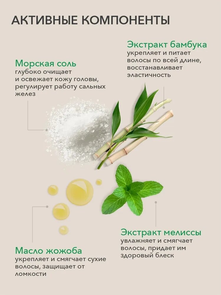 Шампунь-скраб на основе морской соли глубоко очищает и освежает кожу головы, регулирует работу сальных желез, придает объем у корней, стимулирует рост волос, борется с перхотью. Результат: свежесть и чистота надолго.